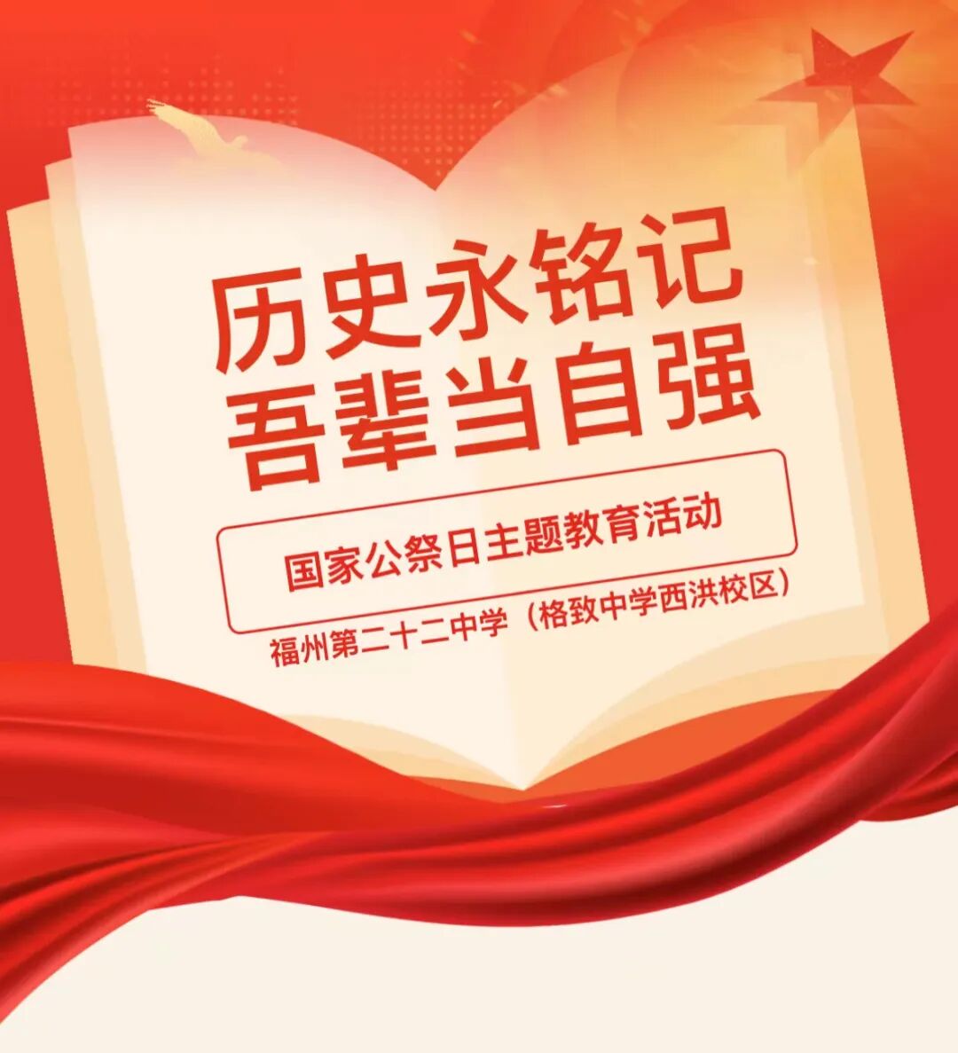 勿忘昨天的苦难辉煌,无愧今天的使命担当,不负明天的伟大梦想。通过国家公祭日主题教育活动的开展,我校师生们进一步唤醒历史记忆,凝聚起“勿忘国耻、砥砺前行”的和平奋斗心愿。同学们从灾难记忆中汲取家国情怀,勇于担当民族复兴、和平发展的历史重任,以更加积极的态度阔步新征程、昂首向未来。