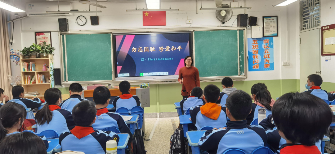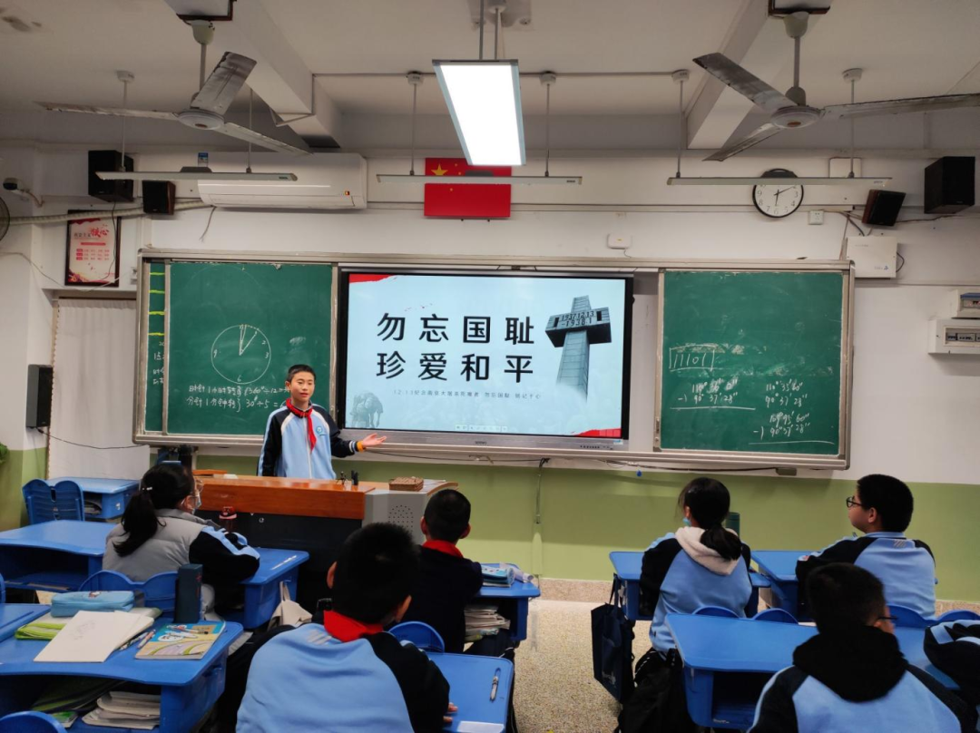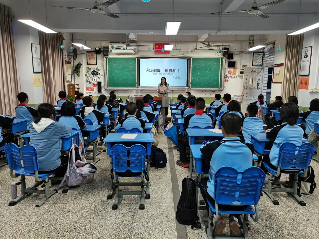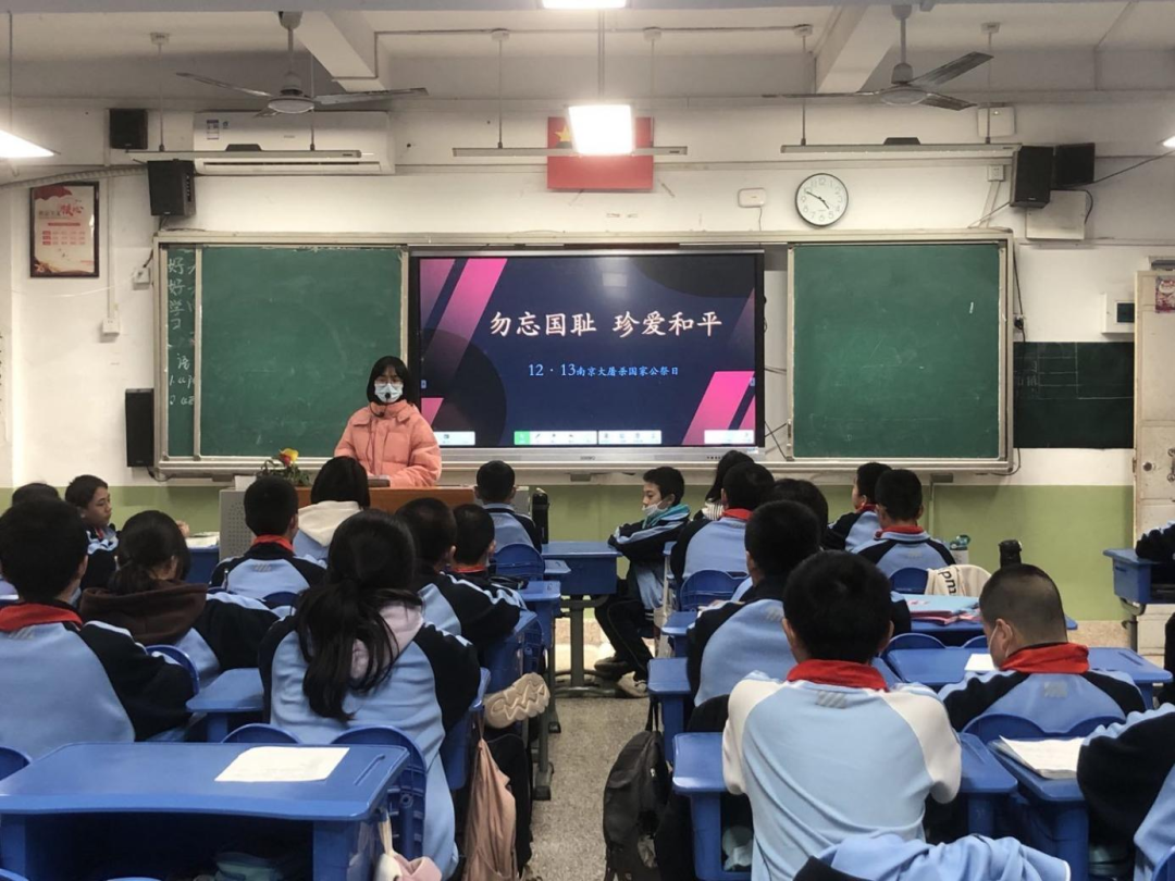 各班级在班主任们的带领下开展了“勿忘国耻,珍爱和平”国家公祭日主题班会课。班主任们通过PPT再现了南京大屠杀时拍摄下的一幕幕悲壮的场面,讲述了南京大屠杀是日本侵华战争初期日本军国主义在中华民国首都南京犯下的大规模屠杀、纵火、抢劫等战争罪行与反人类罪行。通过班会课的学习,同学们认识到了国家公祭日的深远意义,激发了爱国之情,铭记历史,以更加昂扬的姿态、饱满的热情挺起时代脊梁。