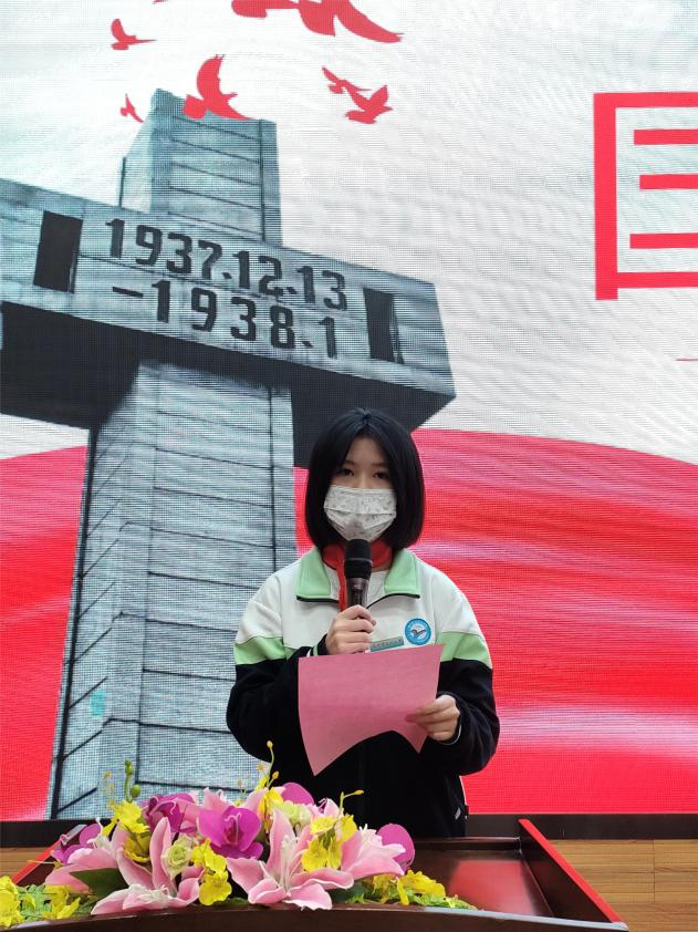我校在周一举行国家公祭日主题升旗仪式,初二(5)班许乐妍同学作为学生代表进行国旗下讲话。南京大屠杀像一条鞭子,狠狠地抽在所有中华儿女的心上,这是中华民族永远不能遗忘的一段血泪史。作为新时代的青少年,我们要有崇高的理想,远大的目标,要自觉地把今天的学习同祖国的繁荣昌盛,民族的富强复兴结合起来。“天下兴亡,匹夫有责。”我们只有学好本领,早日成才,才能为社会主义现代化建设添砖加瓦!