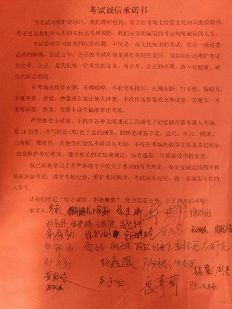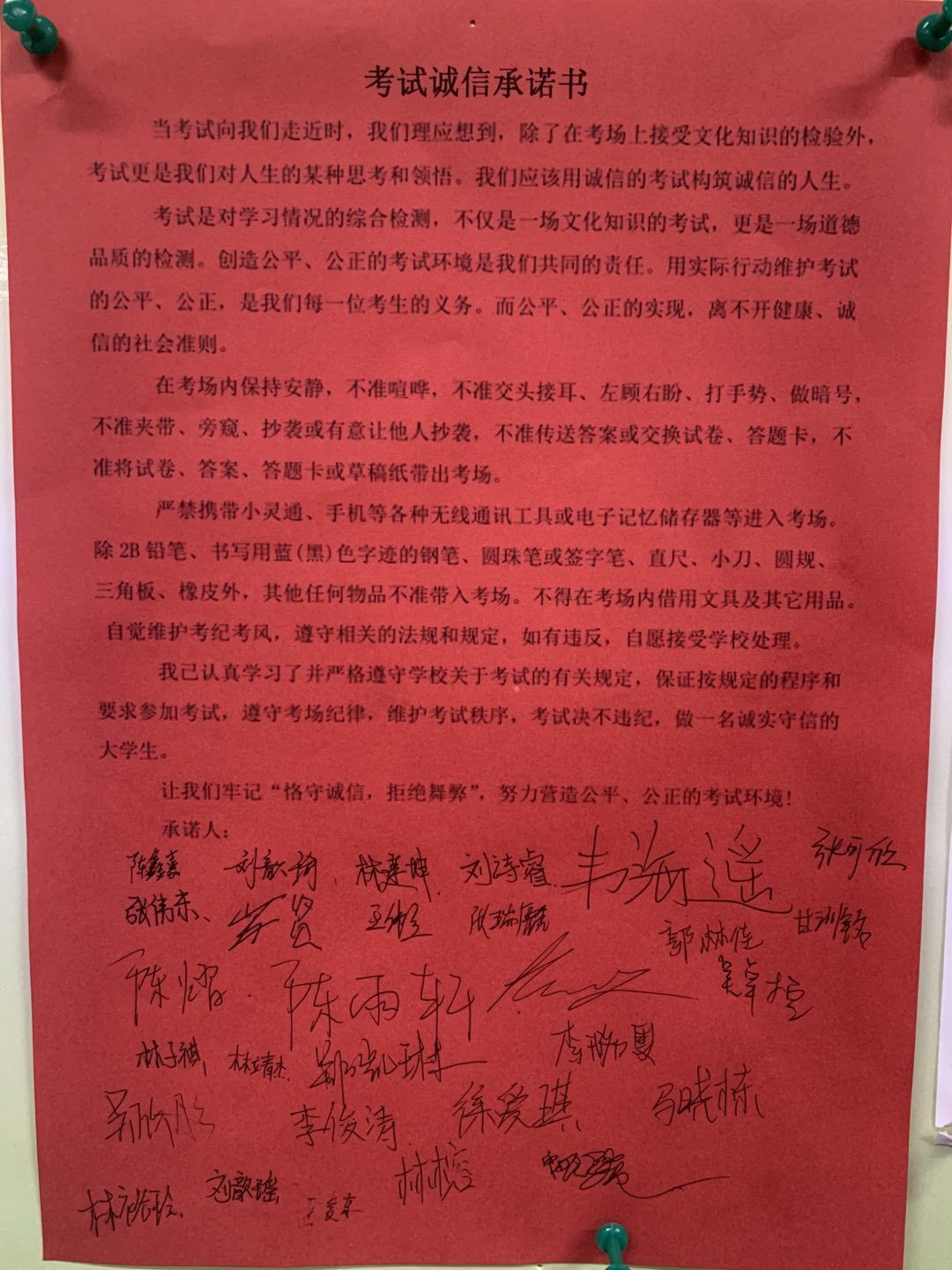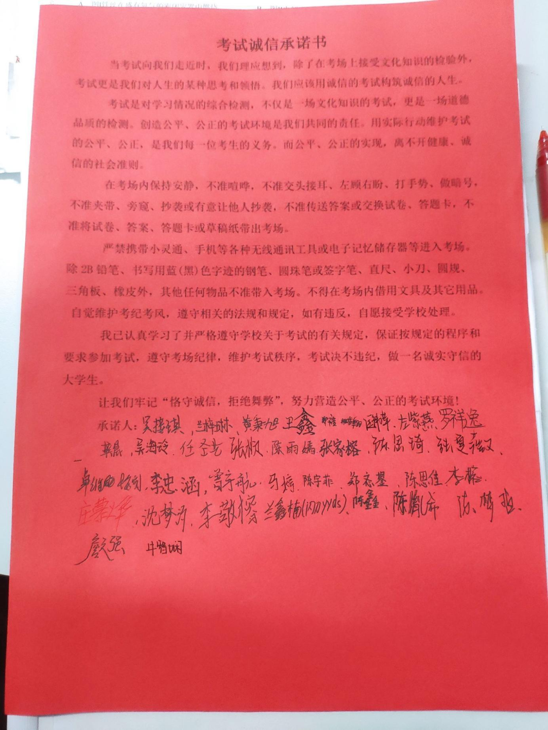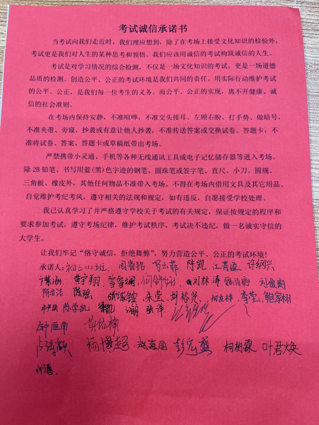 各班级也在班主任的带领下开展《立德修身,诚信为本》的班会课,通过诚信小故事、名言警句乃至有关法律的呈现让同学们知道了诚信的重要性。同学们自发签署了考试诚信承诺书,承诺“恪守诚信,拒绝舞弊”,努力营造公平公正的考试环境。