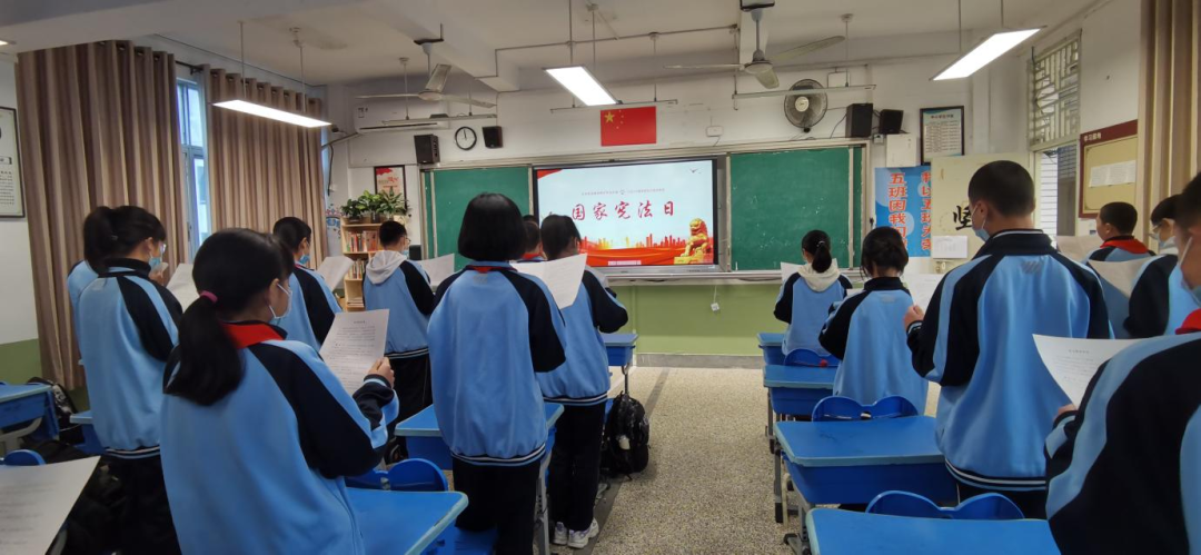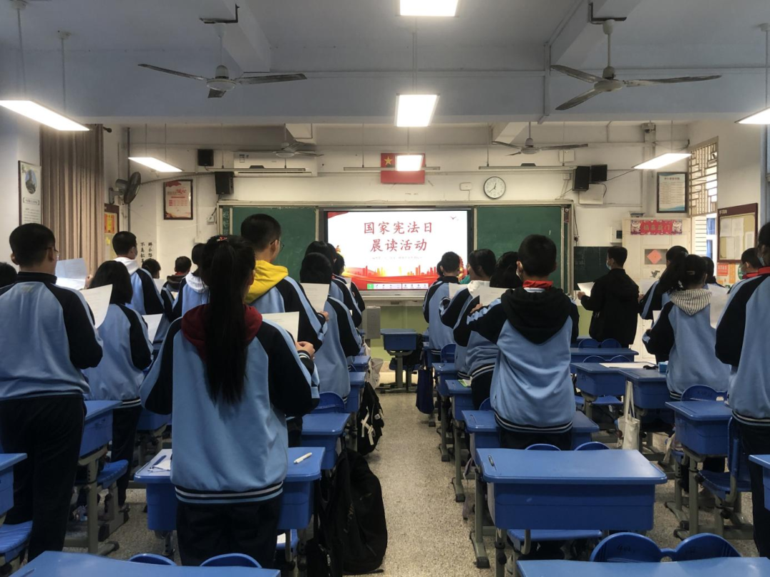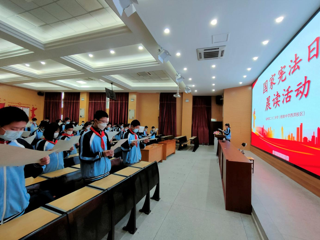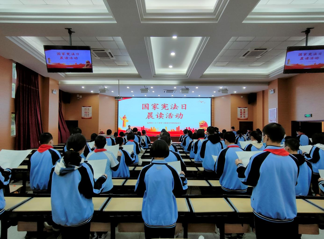 12月2日,我校在阶梯教室、班级内举行了全体学生宪法晨读日活动。师生们诵读宪法部分条例,学习宪法知识,树立起尊重宪法、宪法至上的思想意识。