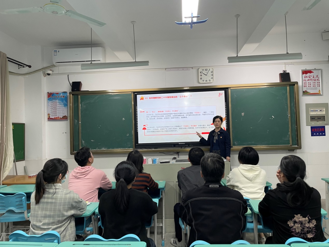 为深入学习贯彻党的二十大精神,文科支部书记刘芳老师和理科支部书记吕燕琴老师在各支部开展了“你好 二十大”为主题的党日活动,从“了解党的二十大、聚焦二十大报告、熟悉的二十大代表们、争做新时代好青年”四个方面做了专题党课。会议强调,党的二十大,是在全党全国各族人民迈上全面建设社会主义现代化国家新征程、向第二个百年奋斗目标进军的关键时刻召开的一次十分重要的大会。二十大报告立意高远、振奋人心、催人奋进,明确宣示了新时期我们党应该向哪里走、以什么样的精神状态走、用什么具体方式走,吹响了全面建成社会主义现代化强国、实现第二个百年奋斗目标的号角。学习贯彻落实党的二十大精神,既要“学进去”“得其门而入”,更要“学出来”“悟其道而出”。也就是要通过读报告原文,用报告中的马克思主义立场、观点、方法,改造主观世界、校正思想行为、推动工作发展,做到学用贯通、知行合一。