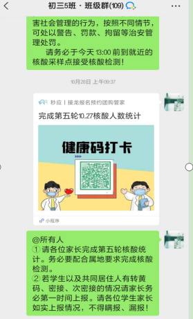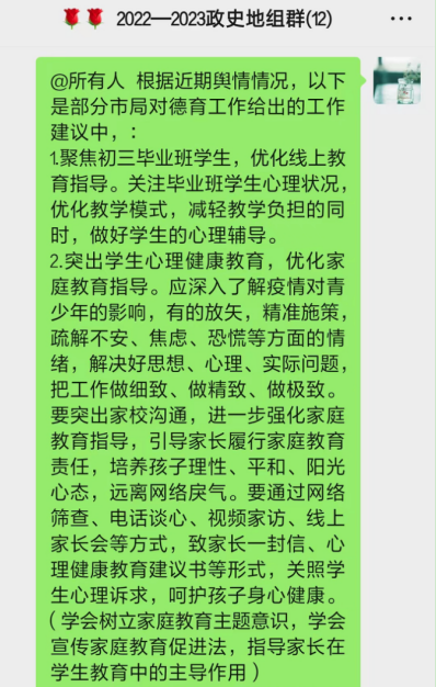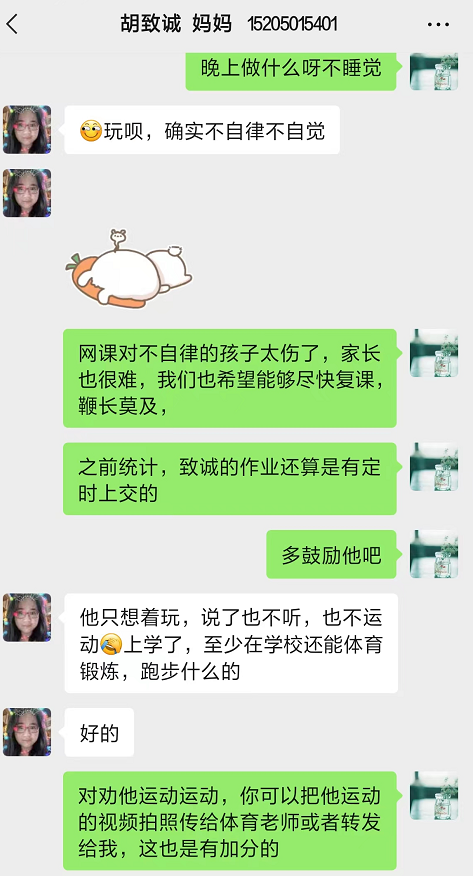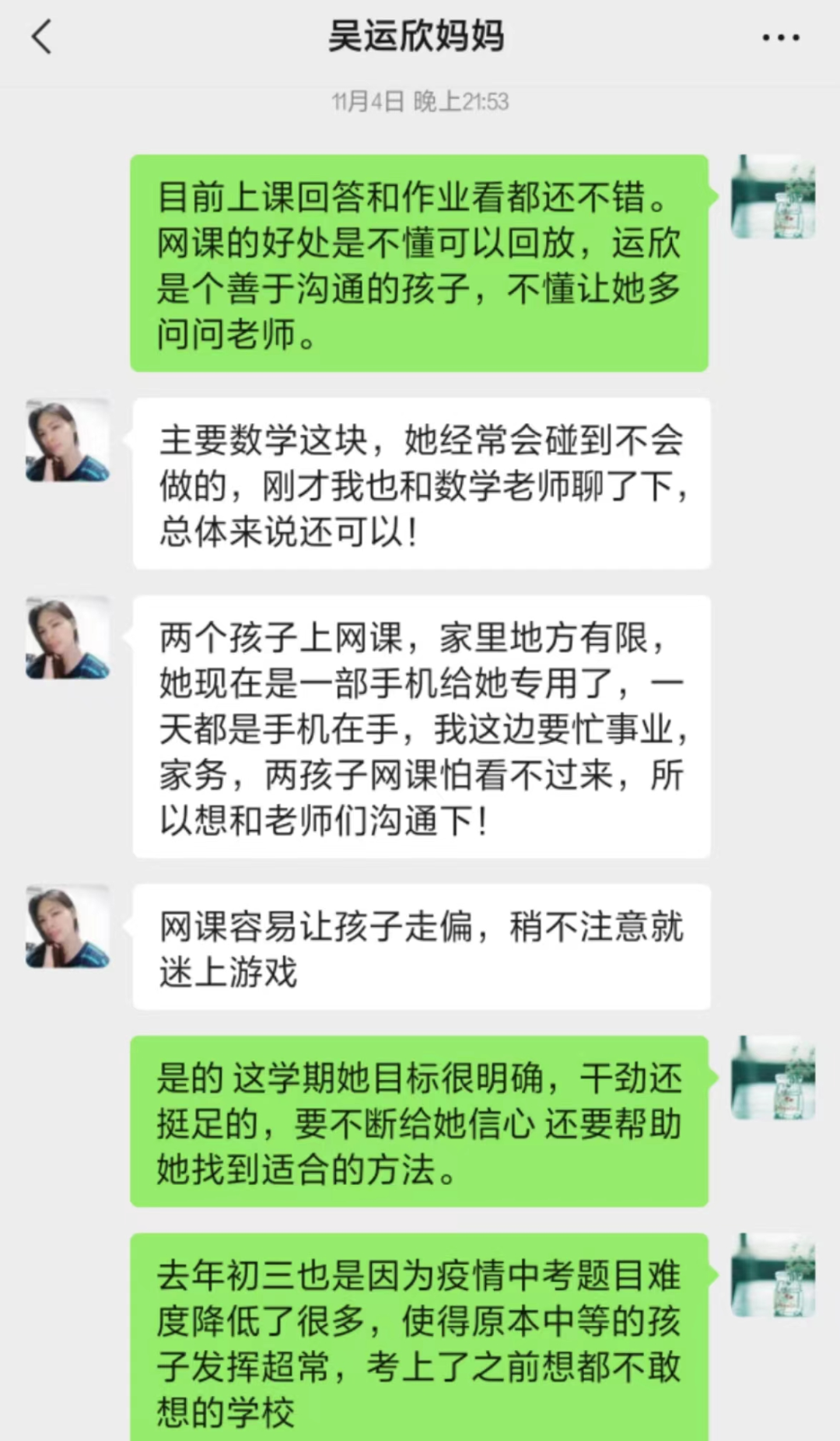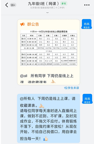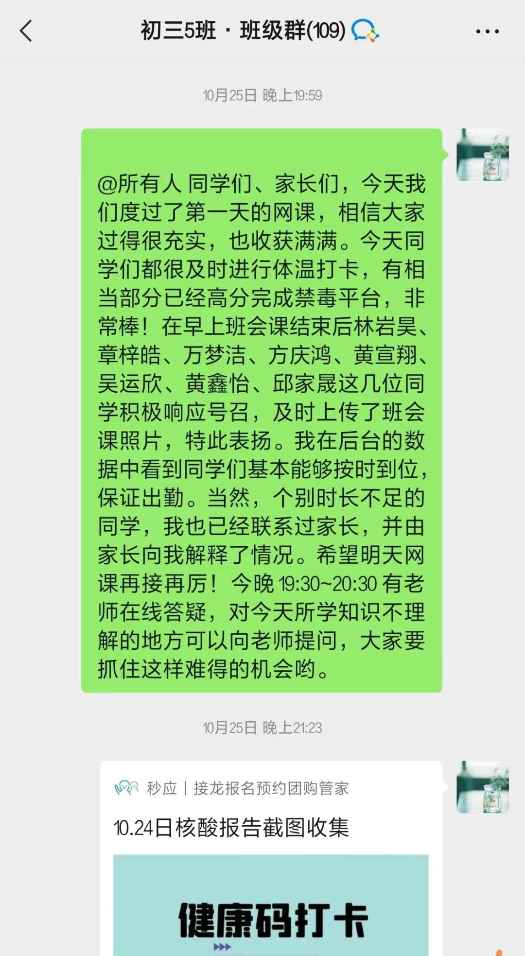 面对疫情带来的种种挑战,肖岚老师正如所有一线老师一样迎难而上,在平凡的岗位上尽职尽责。为了做好疫情防控,她每日在班群定时发布调查问卷、统计上报学生及共居人防控信息,督促孩子做好核酸检测。及时传达每日教学安排和重要通知,关注学生网课情况,提醒学生及时到位。对线上教学进行及时总结。做好家校沟通,及时反馈孩子存在的问题,关注学生的心理健康。肖岚把班级管理的责任扛在肩上,用心守护,温暖陪伴,只为孩子们健康成长。