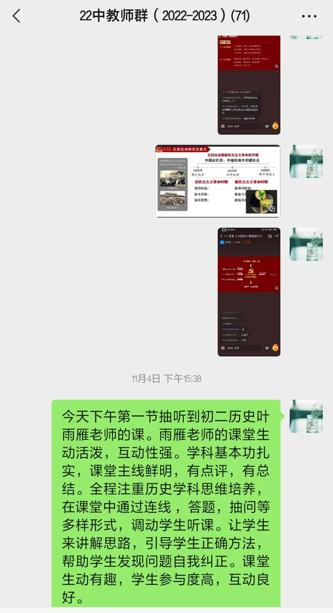 肖岚老师还兼任初三历史集备组长,她积极向本组前辈教师求教,共同探讨教材的处理,集思广益,发挥集体智慧制定教学进度和教学计划。关注年轻教师成长,主动分享教学经验,共同提升教学效率。