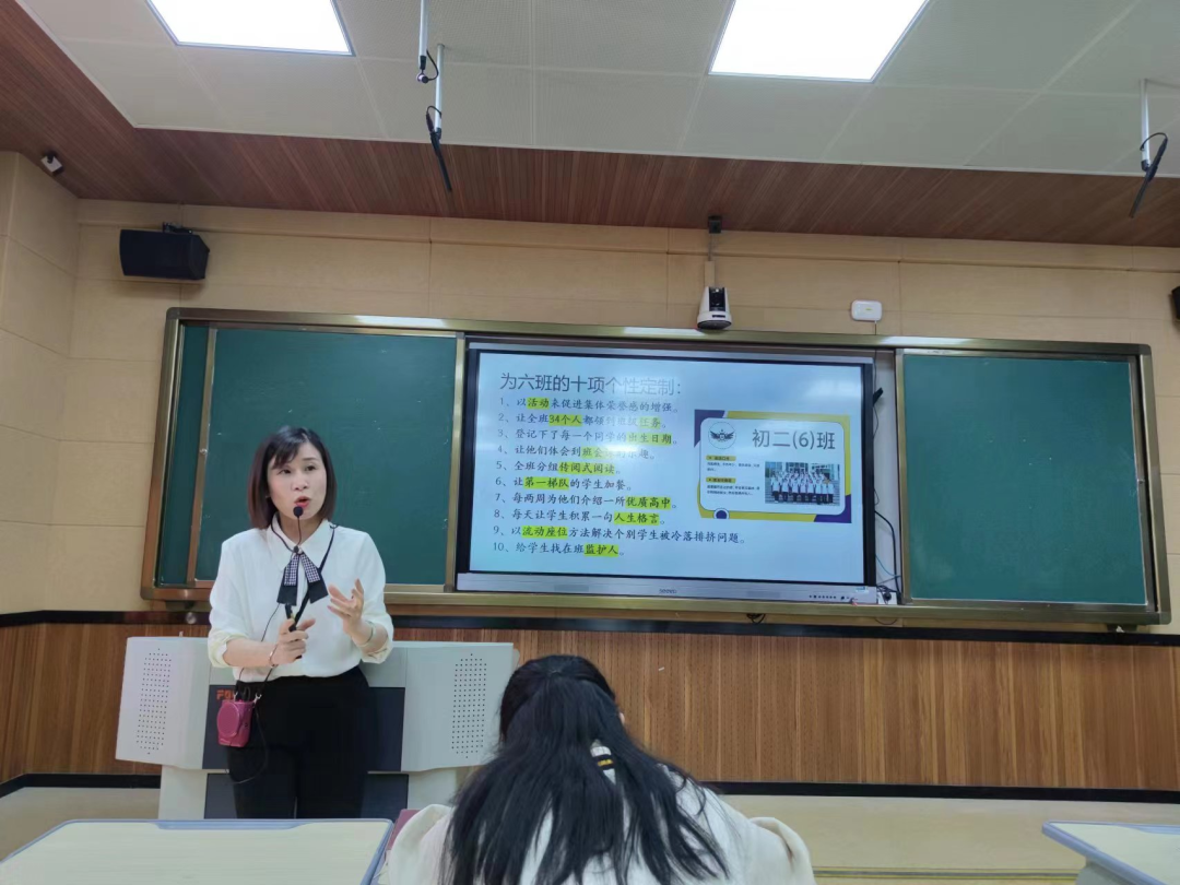 许敏老师一位从教十余年,有着丰富经验的优秀班主任,并在去年来到我校参与一年时间的任教班主任工作,对我校的德育情况有亲身的了解。她将自己支教的班级作为蓝本,从班级制度、学生管理、家长沟通等角度出发,向各位年轻班主任分享如何将班级循序渐进地转化为一个班风优良、积极向上、充满凝聚力的班集体。讲座过程中,许敏老师娓娓道来,绘声绘色,用一个个实实在在的案例展示让大家认识到做班主任的智慧和“巧思”,充分体现了教育有思想、教学有风格、做人有魅力的优秀班主任形象。