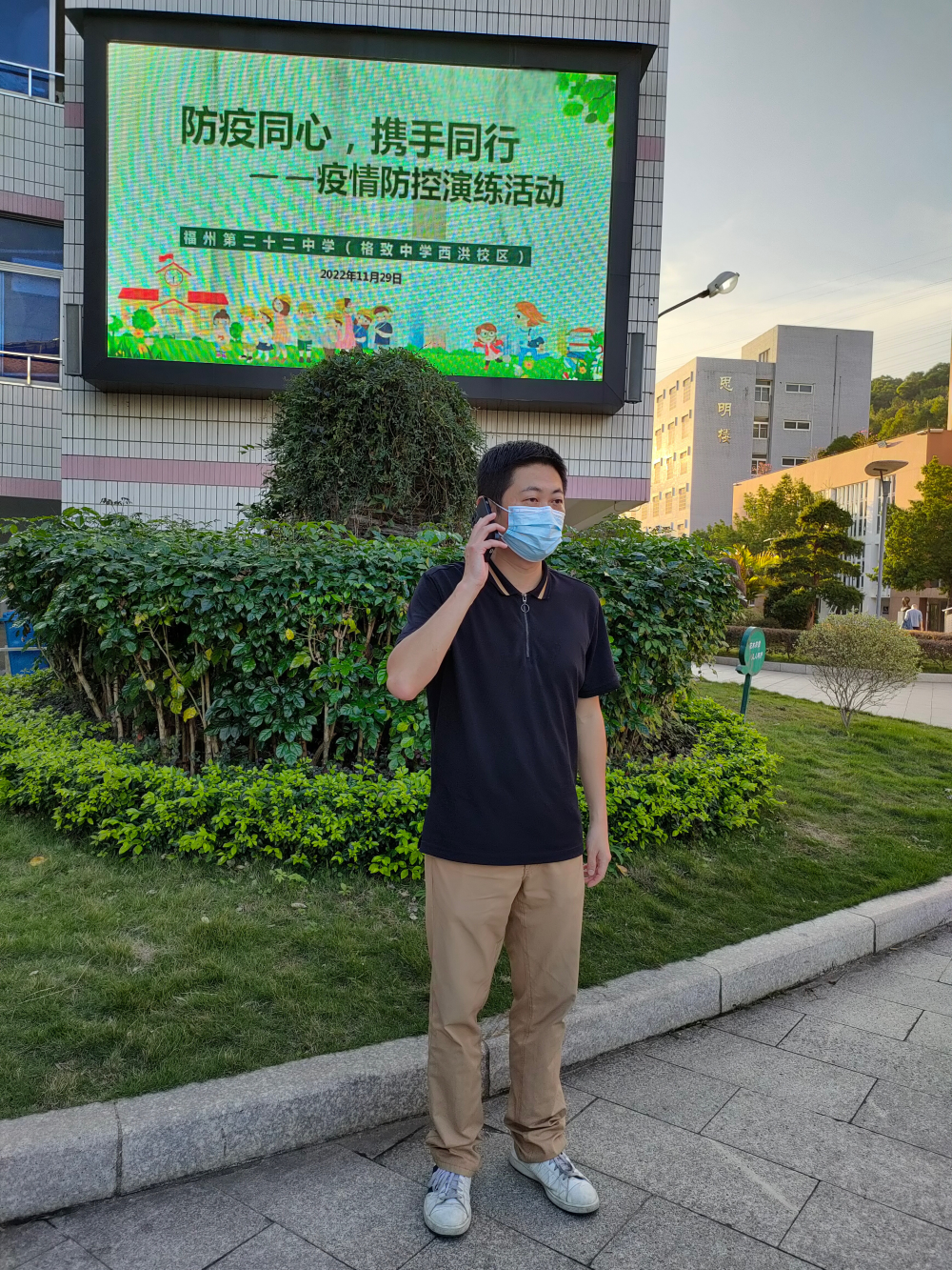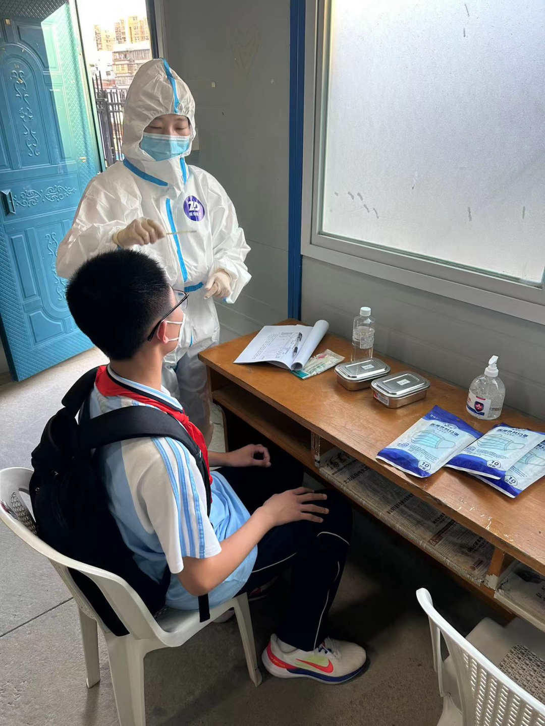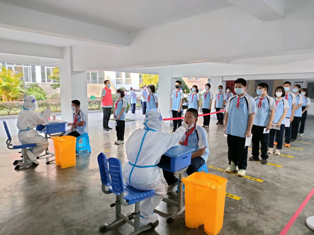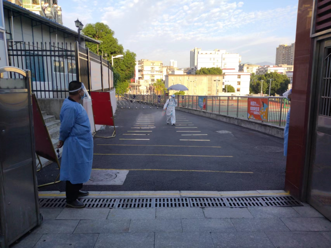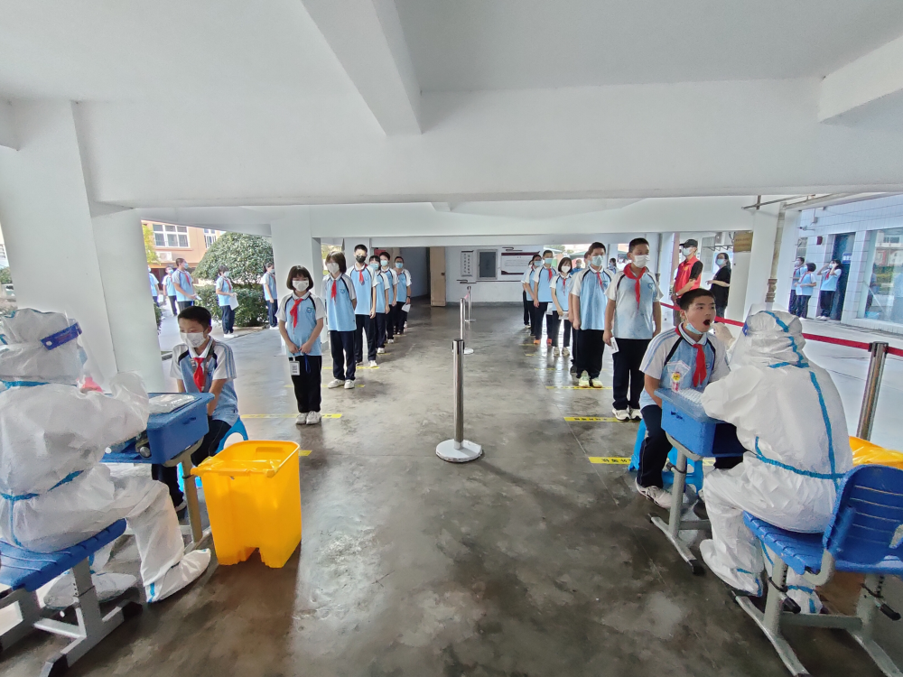 模拟开学后每日核酸抽检工作,要求教师、学生每人间隔1米,排成一列纵队,进行核酸检测。班主任接到通知后,学生拿着e福州预约码,在班主任的带领下到采样点。到场后要求学生每人间隔1米,排成一列纵队,先进行扫码,然后再进行检测。检测好的同学按指定的通道离开。