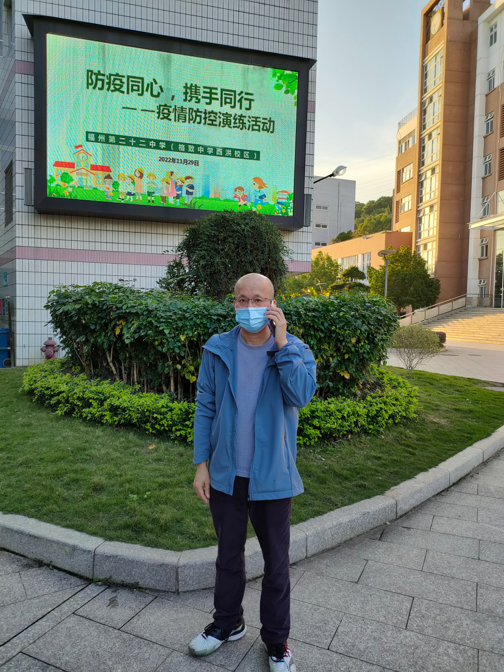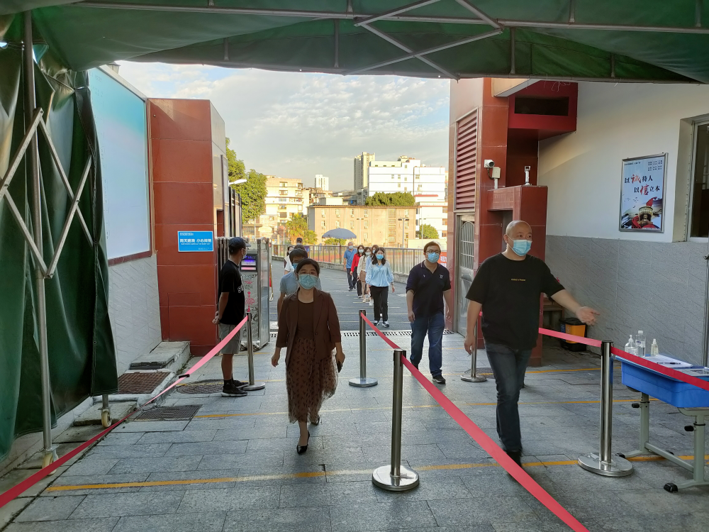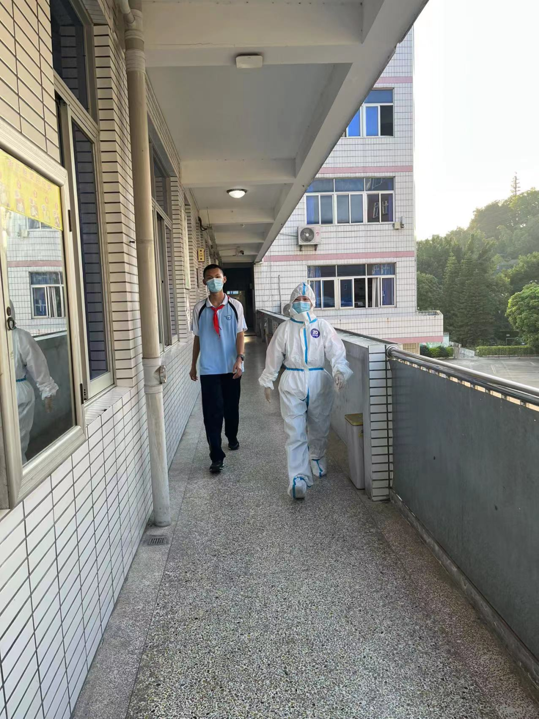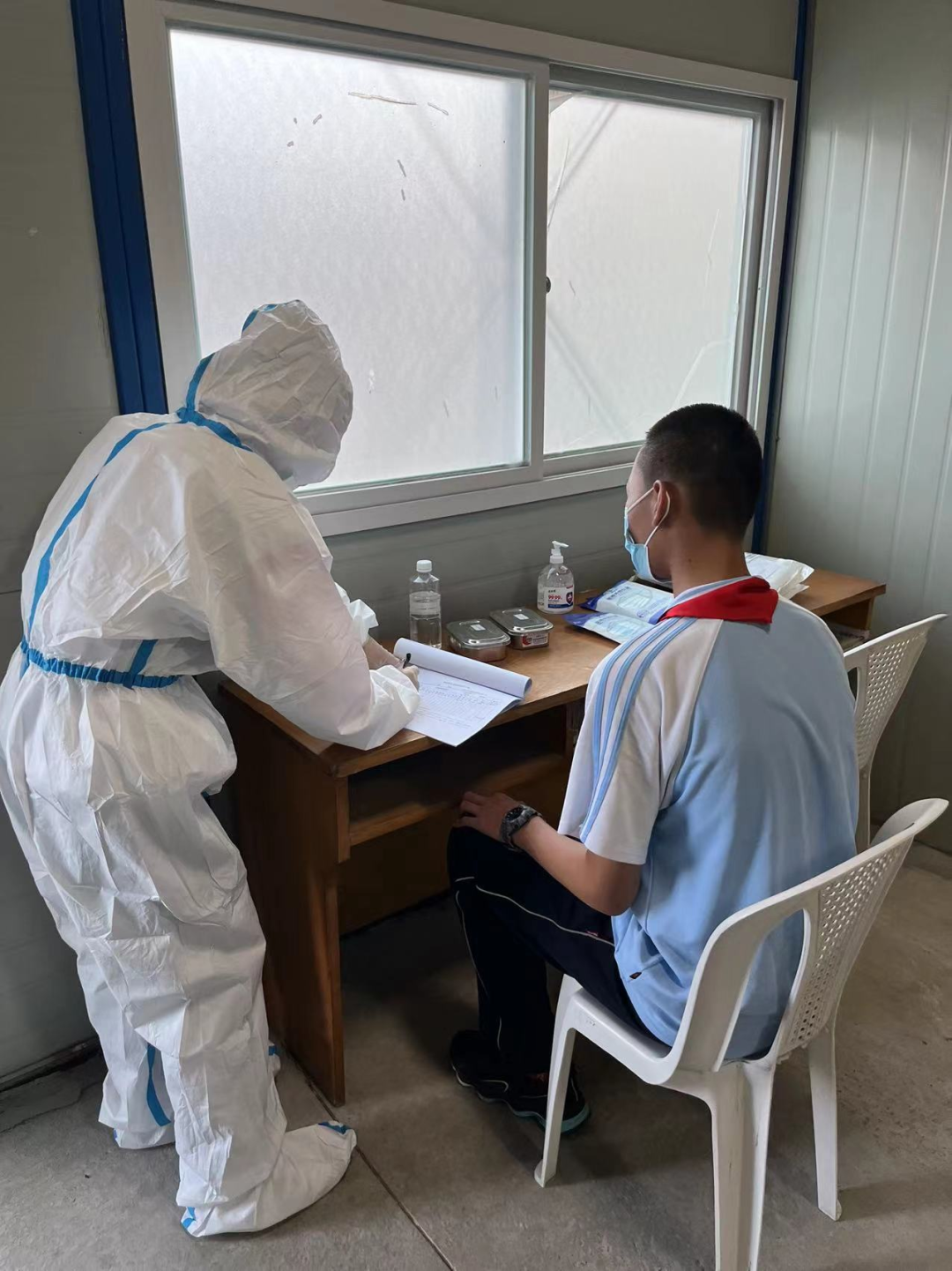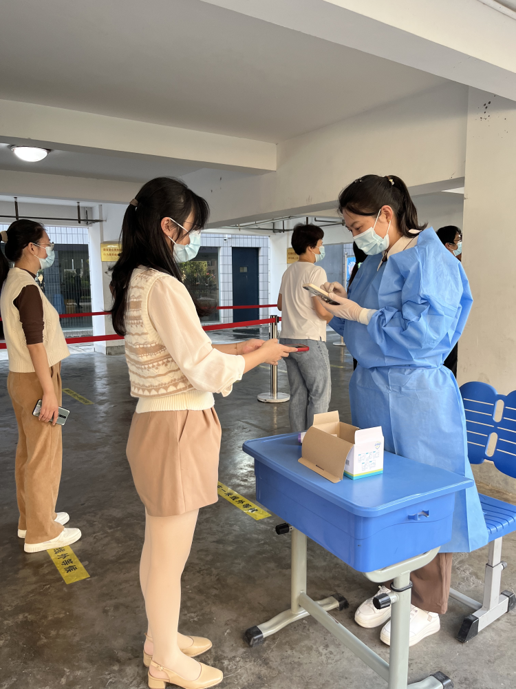 模拟开学后每日核酸抽检工作,要求教师、学生每人间隔1米,排成一列纵队,进行核酸检测。班主任接到通知后,学生拿着e福州预约码,在班主任的带领下到采样点。到场后要求学生每人间隔1米,排成一列纵队,先进行扫码,然后再进行检测。检测好的同学按指定的通道离开。