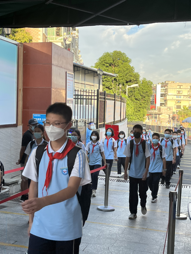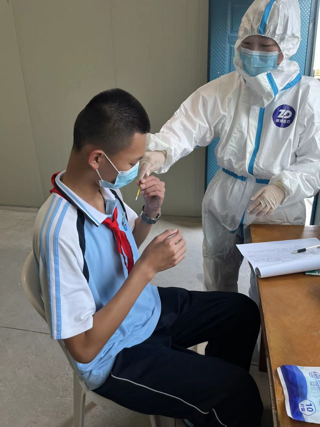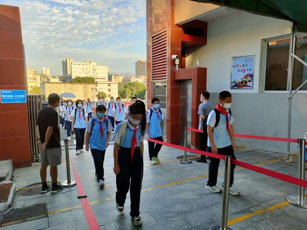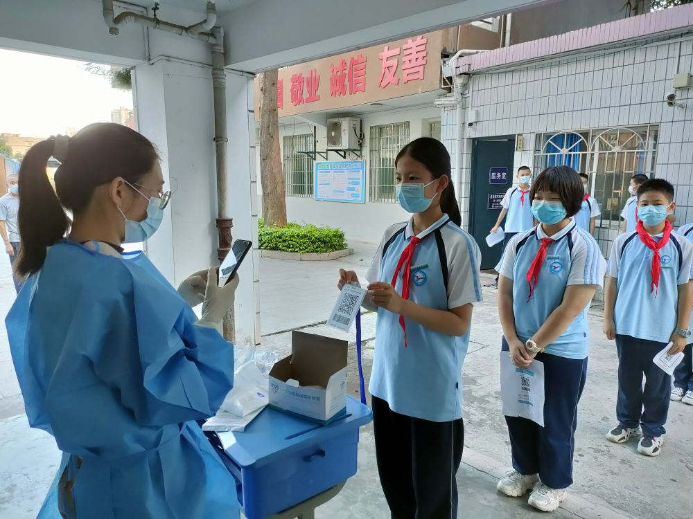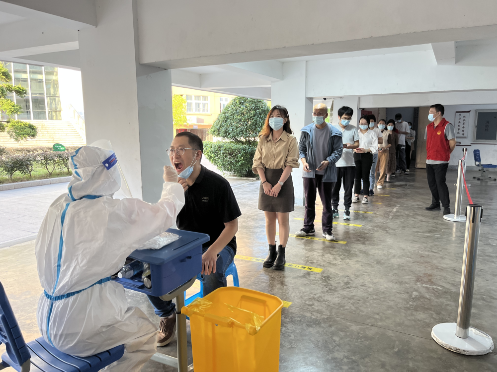 模拟开学后每日核酸抽检工作,要求教师、学生每人间隔1米,排成一列纵队,进行核酸检测。班主任接到通知后,学生拿着e福州预约码,在班主任的带领下到采样点。到场后要求学生每人间隔1米,排成一列纵队,先进行扫码,然后再进行检测。检测好的同学按指定的通道离开。