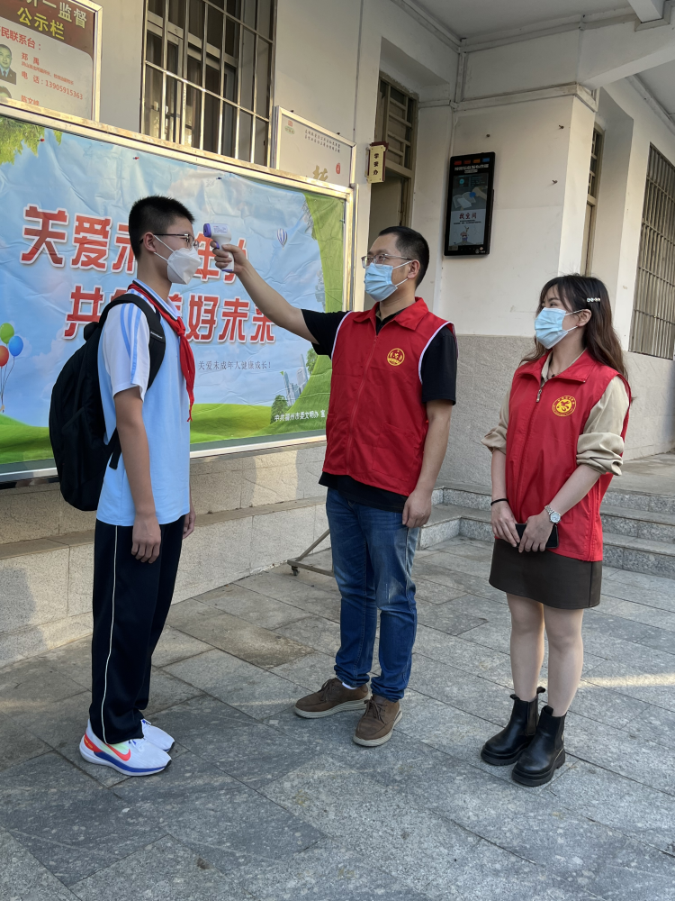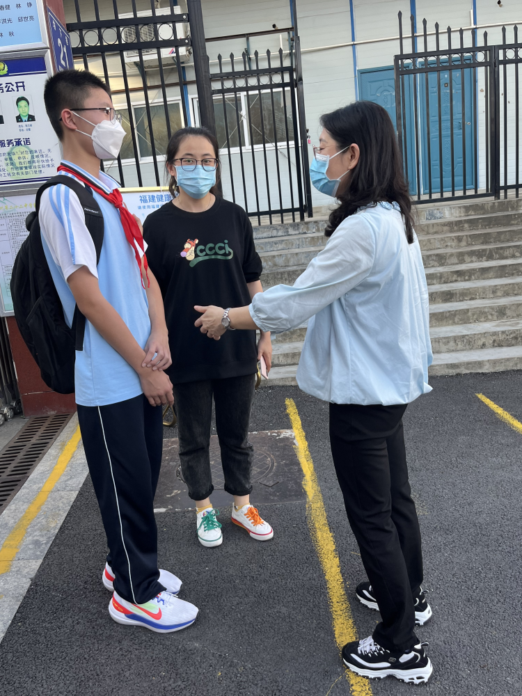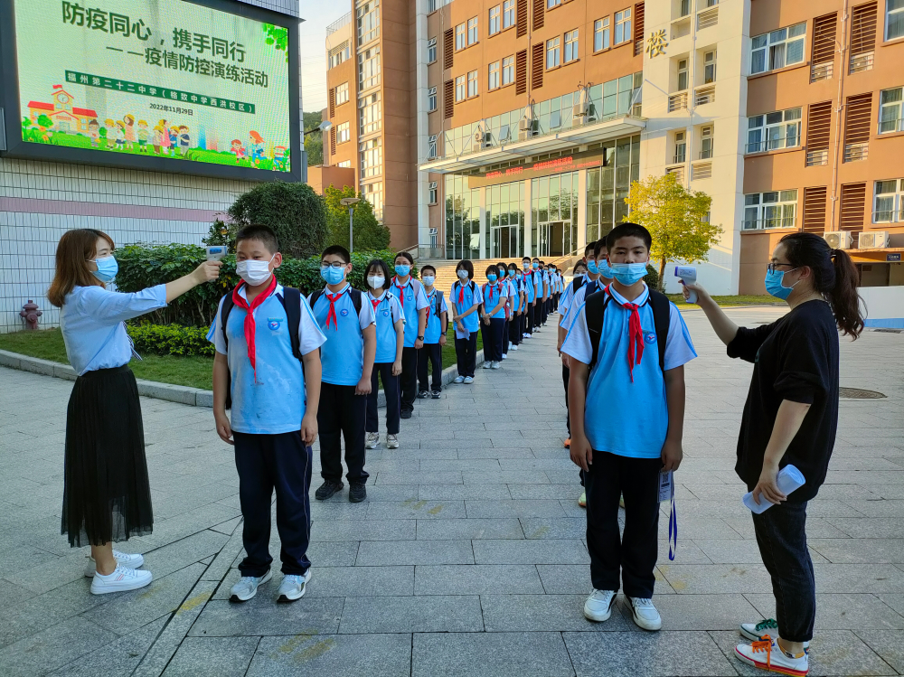 校门口是学校疫情防控的第一道防线,学生进入校门时,执勤领导、老师、保安及校医在校门口认真执勤,并提醒学生戴好口罩,在校门口根据“一米线”排队,有序引导学生进入校园进行体温测量。