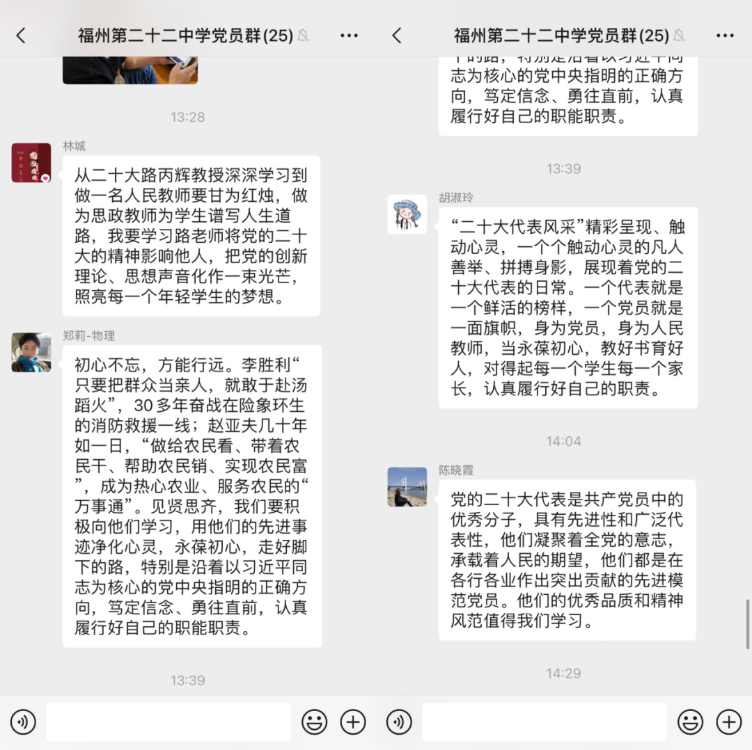 在开展学习活动中,党员同志们将深入学习二十大代表风采与学习习近平新时代中国特色社会主义精神相结合,与疫情防控工作相结合,与日常教学工作相结合,紧扣自身岗位职责,谈心得、忆初心、提措施,纷纷表示要学习党的二十大代表忠诚履职的责任感,自觉向榜样看齐,时刻不忘初心、牢记使命,以实际行动为学校的发展作贡献。