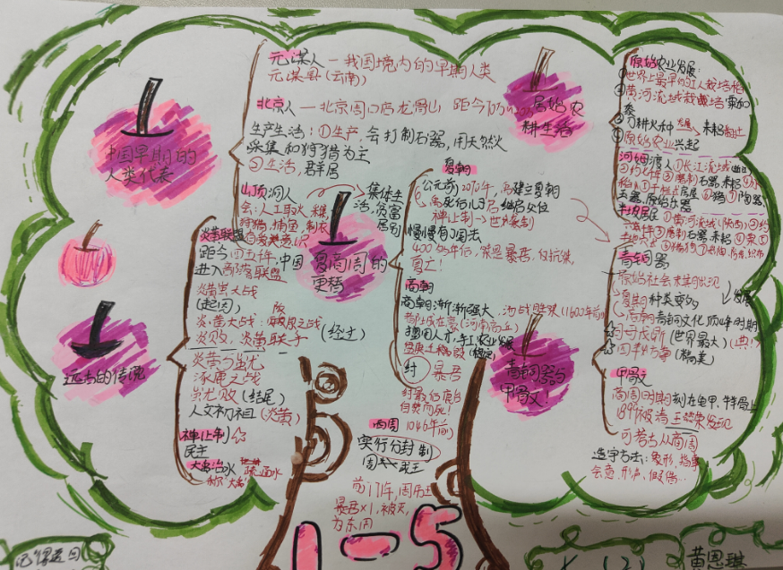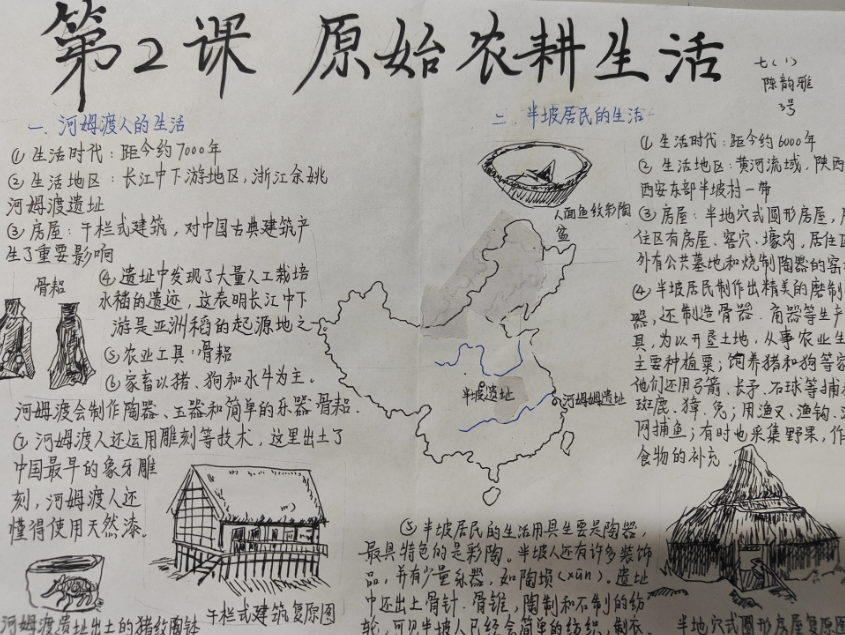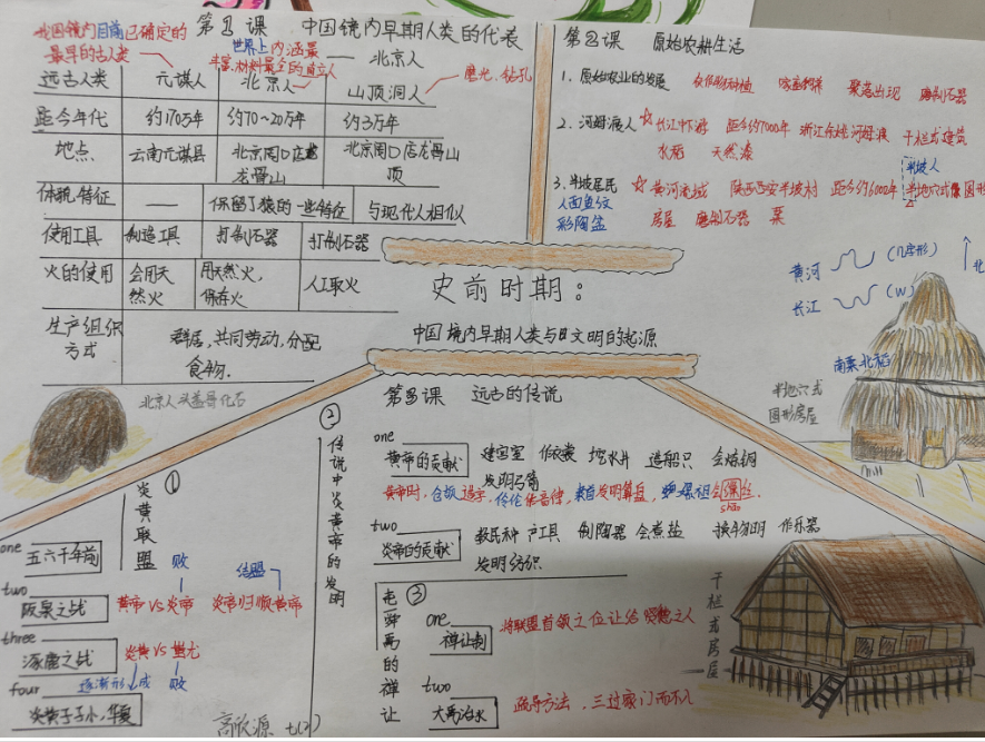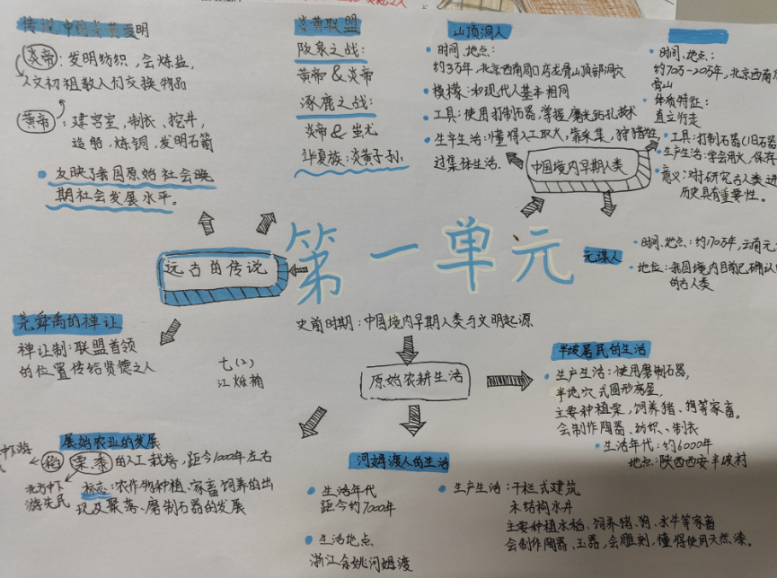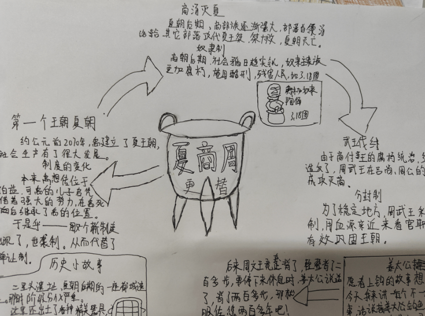 思维导图是将零散的历史信息整合成一个完整的知识体系重要途径,文物无声却记录着来自时代的世事变迁。为了提升刚接触历史的初一同学的学习兴趣,多途径认识历史,培养学生历史核心素养,初一历史集备组开展了“以笔绘史,巧手匠心”的综合实践作业活动。通过设计和绘画单元历史思维导图、仿制感兴趣的历史文物等方式,让学生领略历史文化的独特魅力。