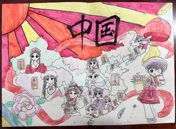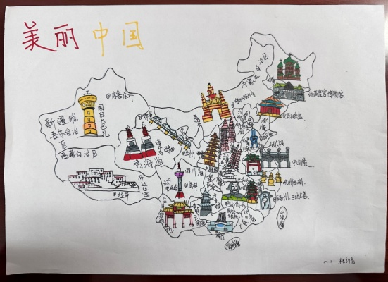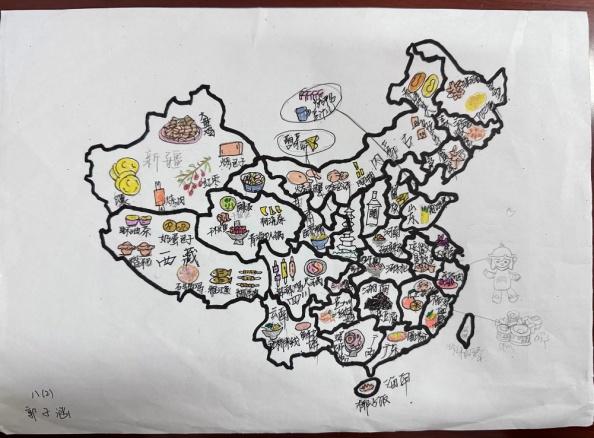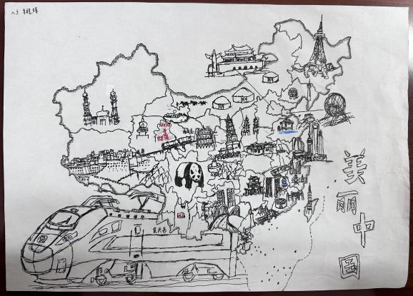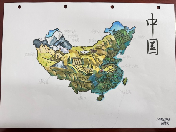 八年级地理学习主题为“中国地理”。我国疆域辽阔,地大物博,不同地域的自然环境及风土人情各异。八年级地理集备组举办了“美丽中国”手绘地图大赛,同学们踊跃参赛,充分发挥自己的想象力,涌现出一批各具特色的作品。“愿以寸心寄华夏,且将岁月赠山河”,同学们在描绘中国地图的过程中,不仅认识了中国不同地域的特色,也激发了爱国情怀。
