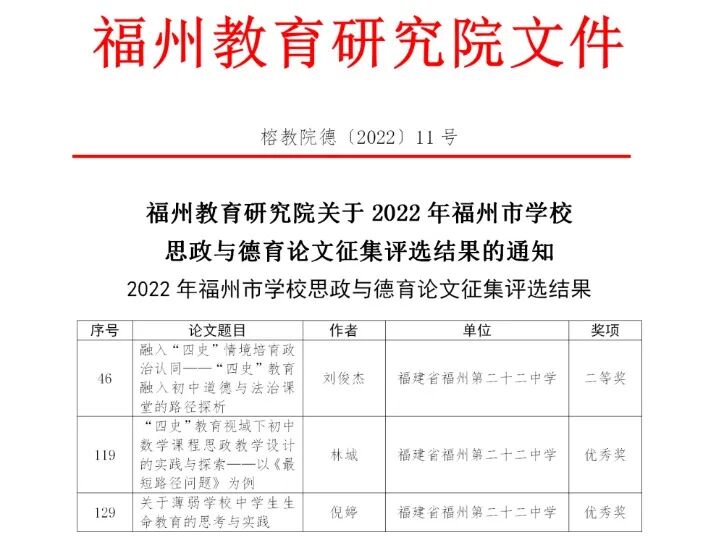 根据《福州教育研究院关于2022年福州市学校思政与德育论文征集评选活动的通知》(榕教院德〔2022〕2号),由福州教育研究院组织的2022年福州市学校思政与德育论文征集评选活动落下帷幕。我校刘俊杰老师、林城、倪婷老师发挥自己自身所长,结合自身的思政德育工作经验,在群英荟萃的评选活动中斩获荣誉。最终,刘俊杰老师荣获二等奖,林城老师、倪婷老师荣获优秀奖!