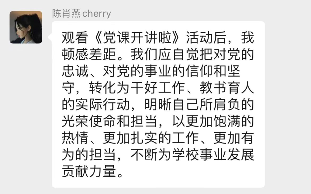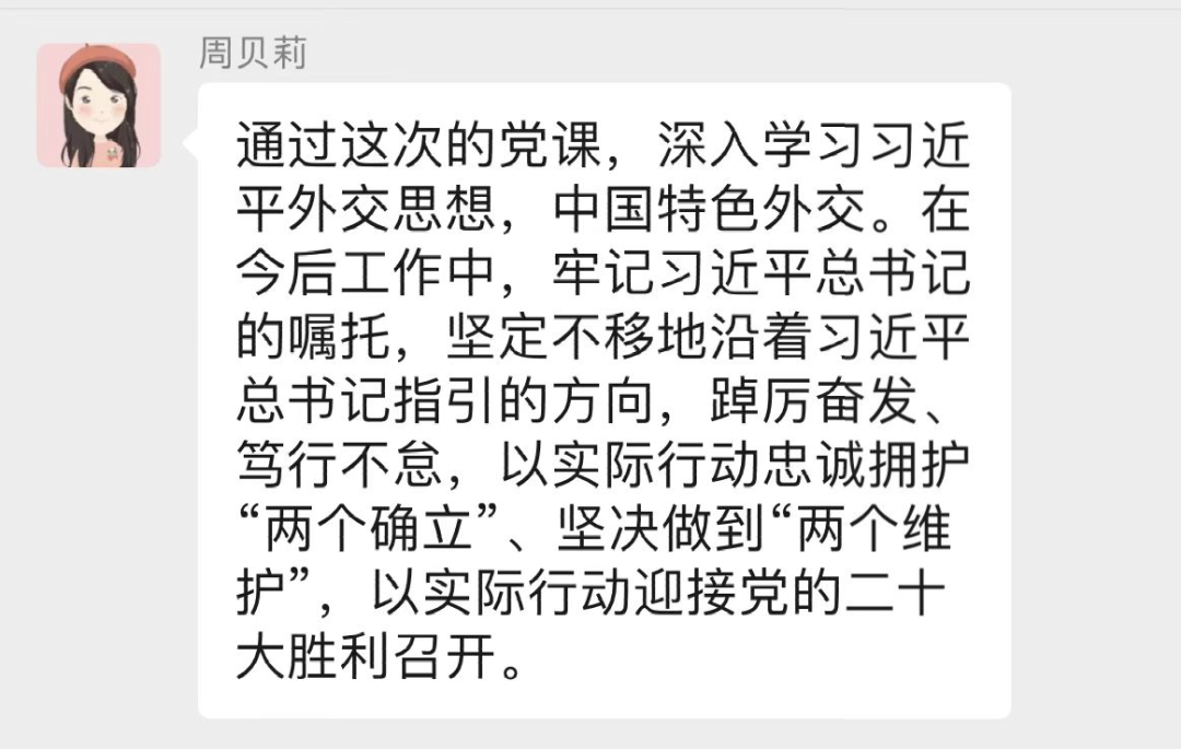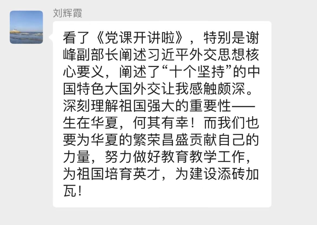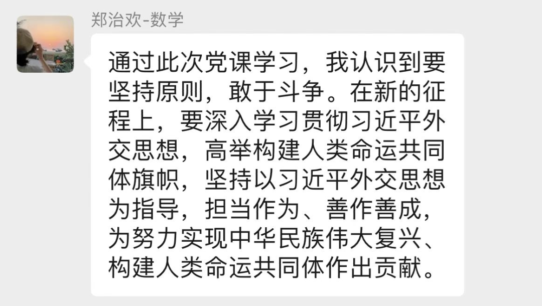通过党课学习,更加深刻领悟了习近平外交思想与时俱进、守正创新的理论品格。习近平外交思想在汲取中华优秀传统文化精华、弘扬新中国外交优良传统的基础上,站在时代最前沿,直面人类新挑战,大力推进中国外交的理论与实践创新。作为教育工作者肩负“培根铸魂,启智润心”之责,为党育人,为国育才,我们永远在路上。