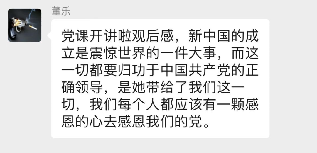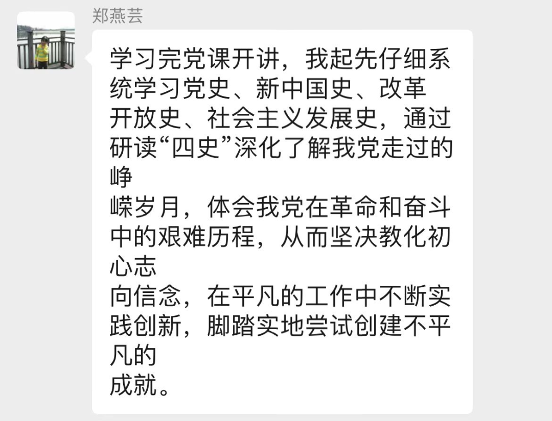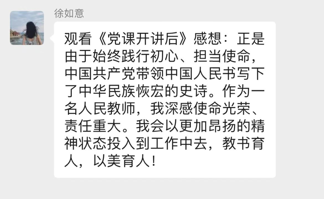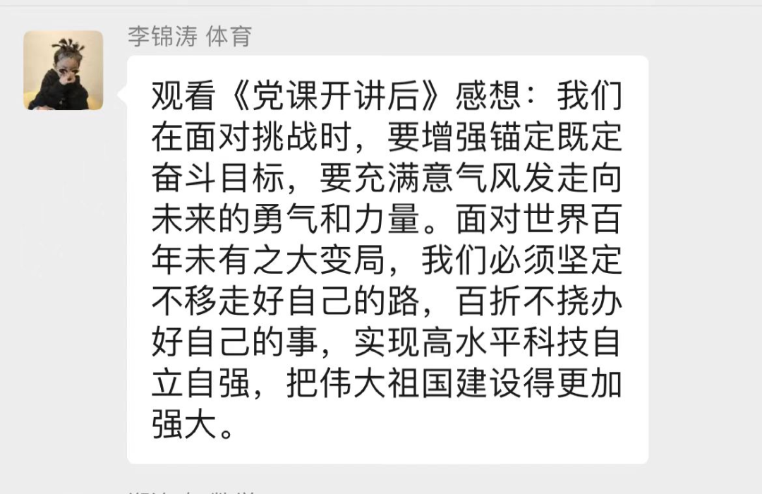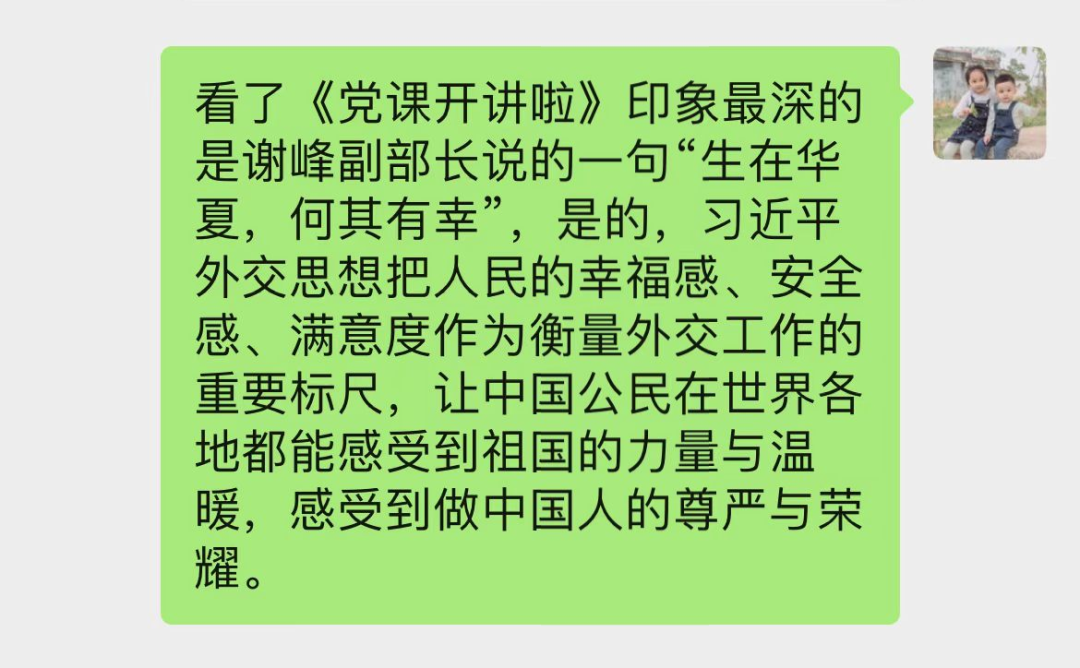 通过党课学习,更加深刻领悟了习近平外交思想与时俱进、守正创新的理论品格。习近平外交思想在汲取中华优秀传统文化精华、弘扬新中国外交优良传统的基础上,站在时代最前沿,直面人类新挑战,大力推进中国外交的理论与实践创新。作为教育工作者肩负“培根铸魂,启智润心”之责,为党育人,为国育才,我们永远在路上。