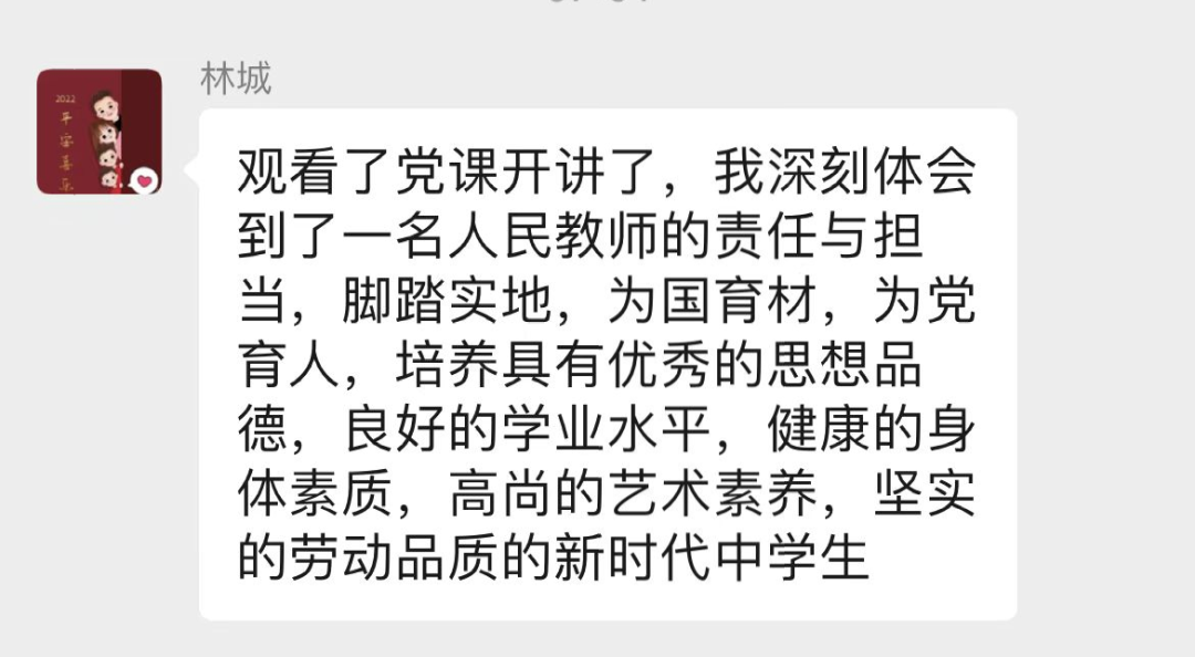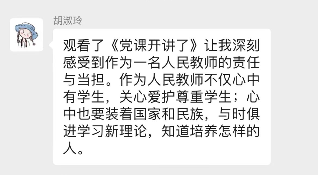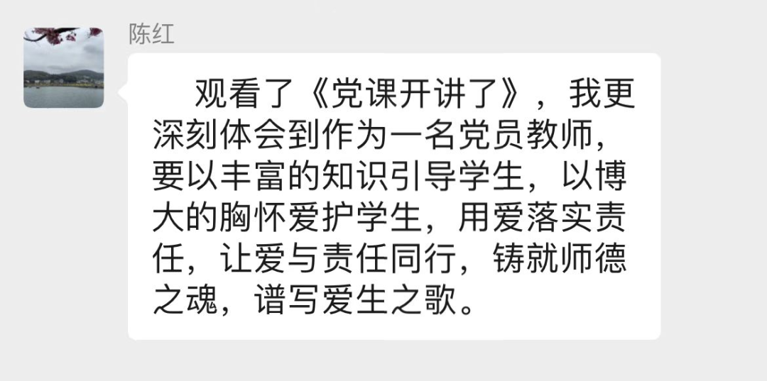 通过观看《党课开讲啦》,我感受到中国共产党坚守为世界谋大同的天下情怀,坚守和平、发展、公平、正义、民主、自由的全人类共同价值,积极推动构建人类命运共同体,始终做世界和平的建设者、全球发展的贡献者、国际秩序的维护者,为解决人类问题贡献了中国智慧和中国方案,为人类文明和进步事业作出了卓越贡献。作为一名党员教师,虽不能成就惊天动地之伟事,却可以坚守岗位,不忘初心,兢兢业业为学生全面发展服务,让家长放心,社会满意,倾尽所能为所从事的教育事业贡献自己的力量!