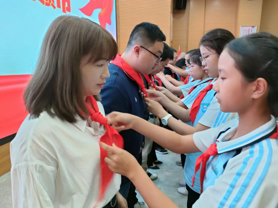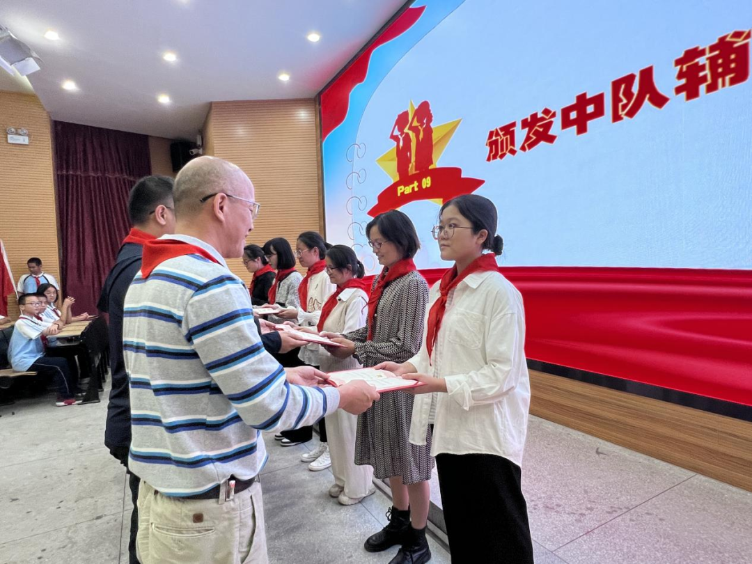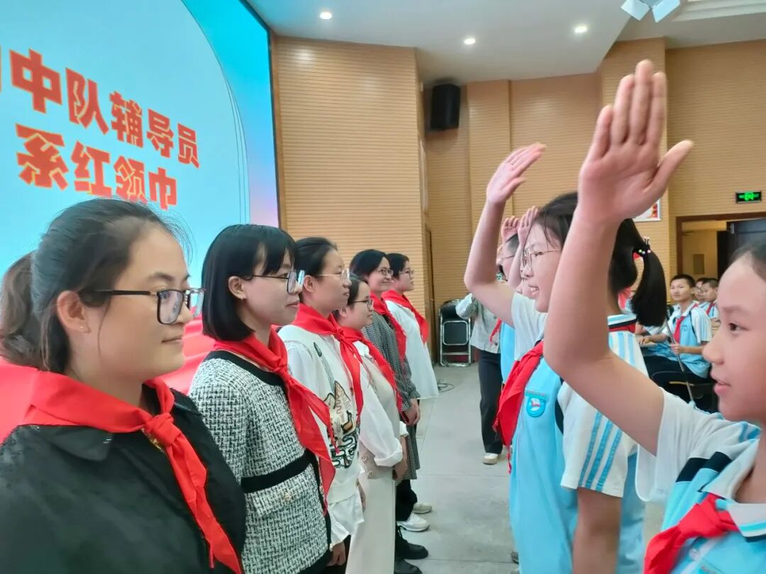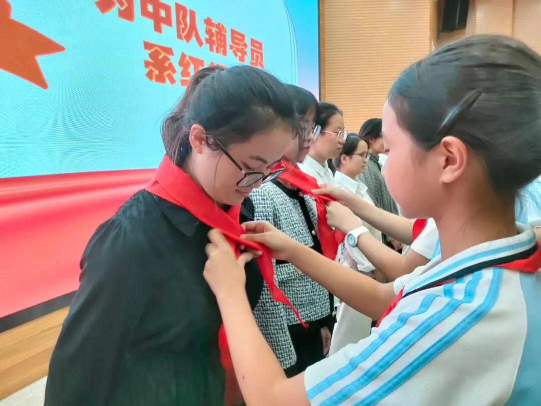 少先队员代表上台为辅导员老师们佩戴红领巾,并向老师们行队礼致敬。