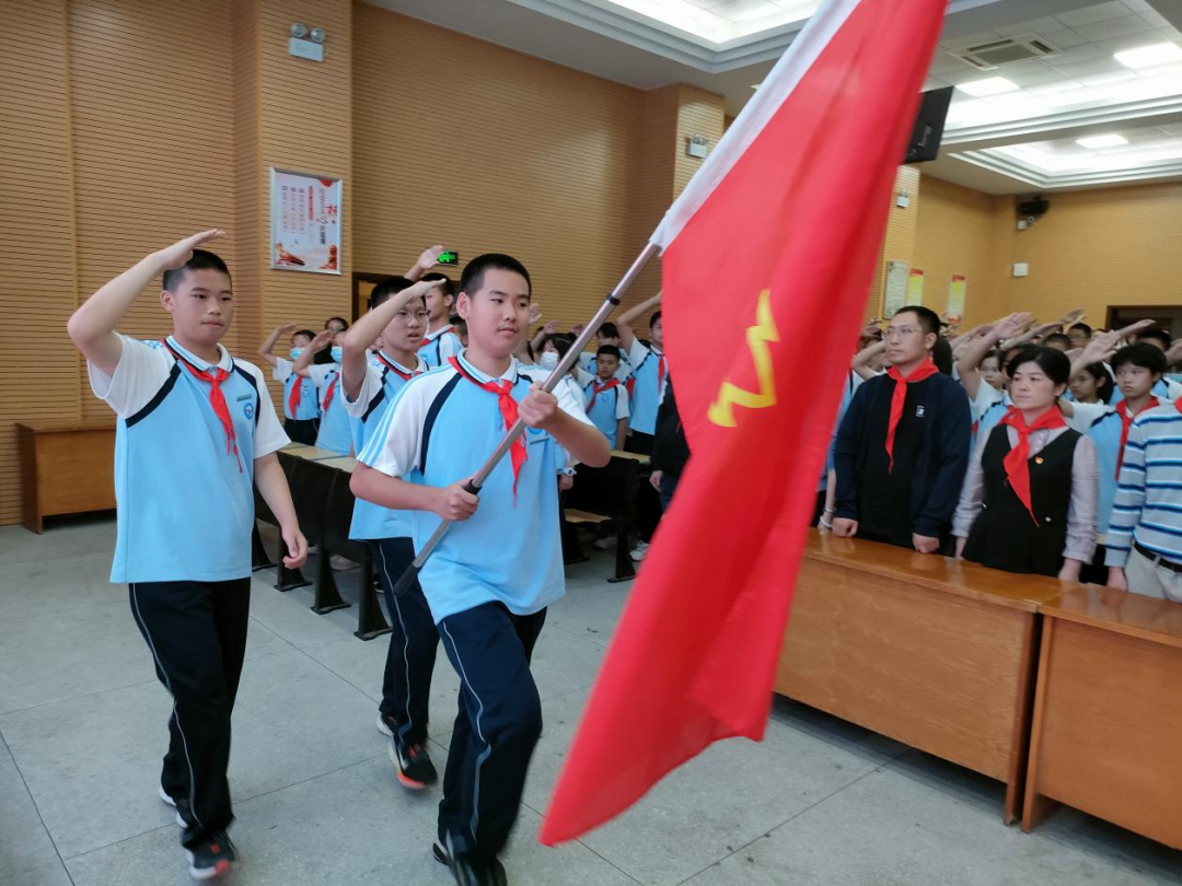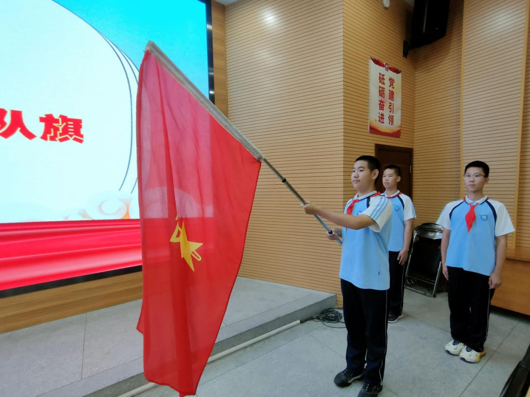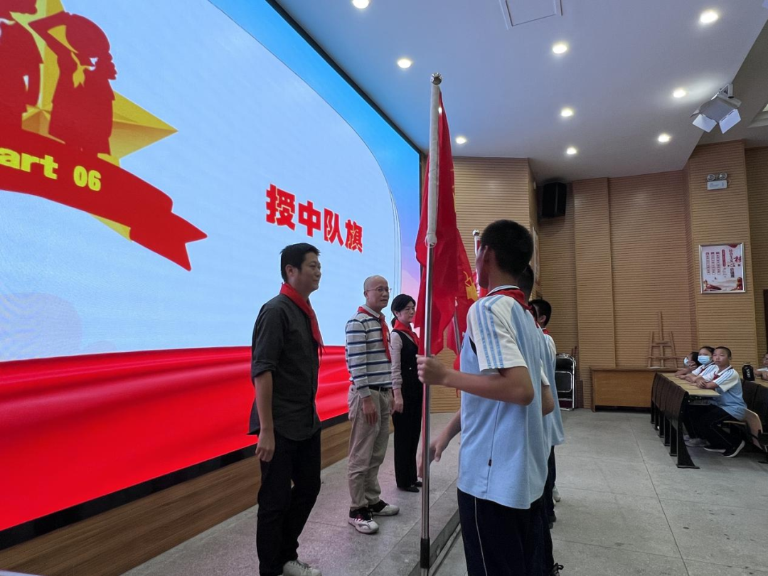 火红的队旗高高飘扬,指引我们前进的方向,新的队员组成了新的中队。校领导为新建中队授旗,各中队少先队员代表接旗并向全体少先队员展示。