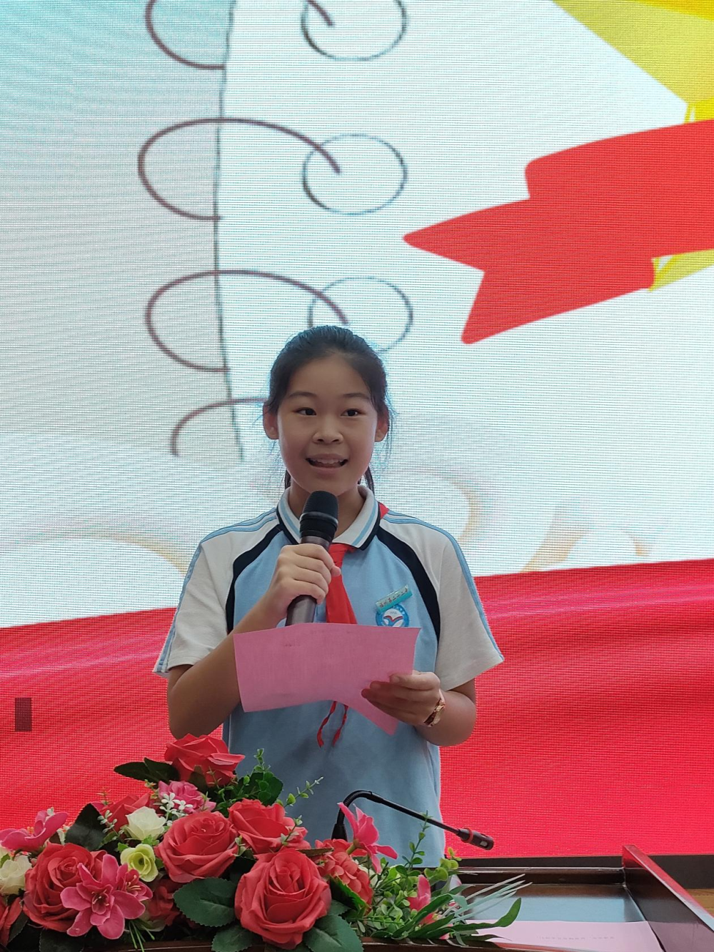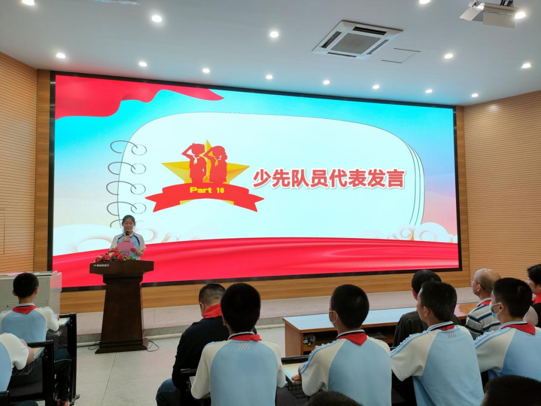 七(4)中队张曦慧同学作为少先队员代表发言。她表达了刻苦学习科学文化知识,积极参与志愿者服务,努力成为优秀少先队员的决心。她呼吁全体少先队员在人生成长的新阶段,铭记在星星火炬旗下发出的誓言,把握现在,以最好的精神面貌,喜迎二十大,争做好队员!