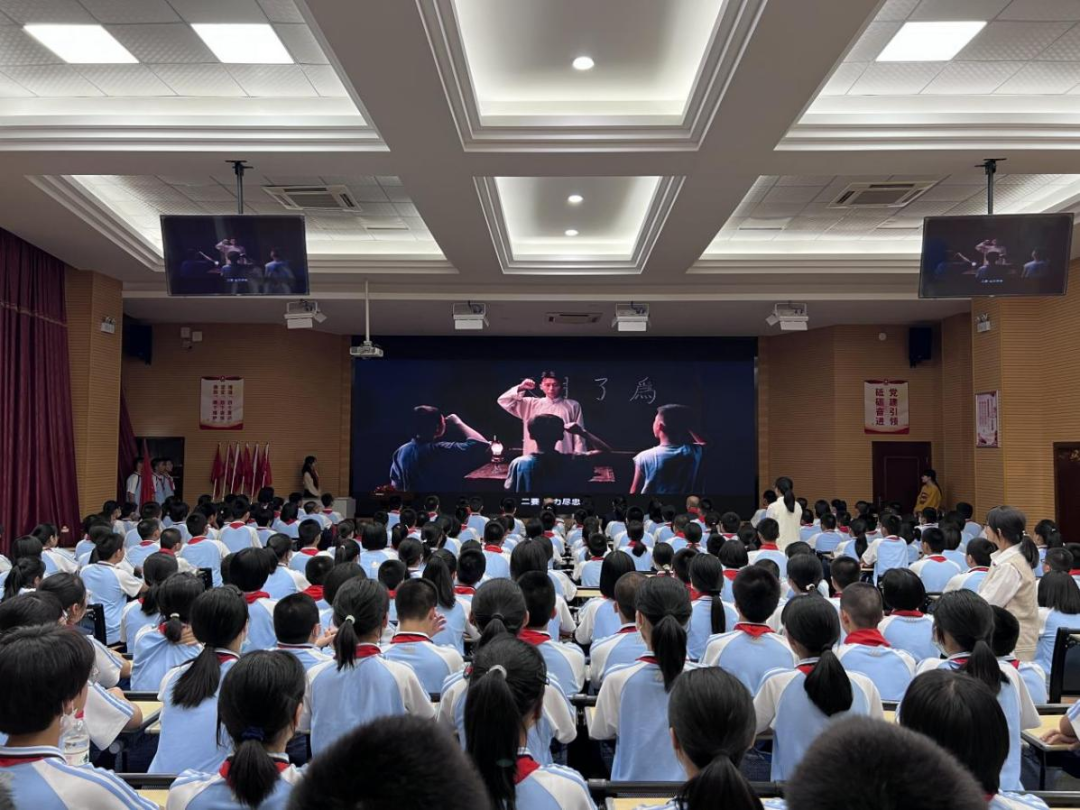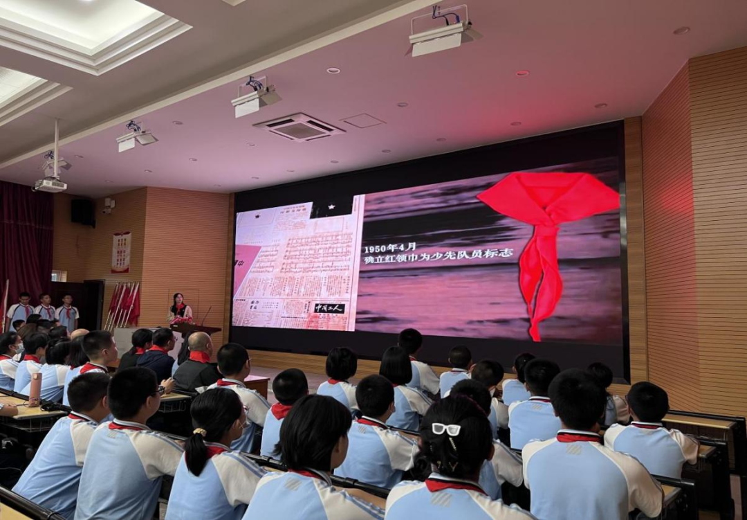 全体师生一同观看视频短片《致敬红领巾》,回顾少年先锋队的光辉历程。