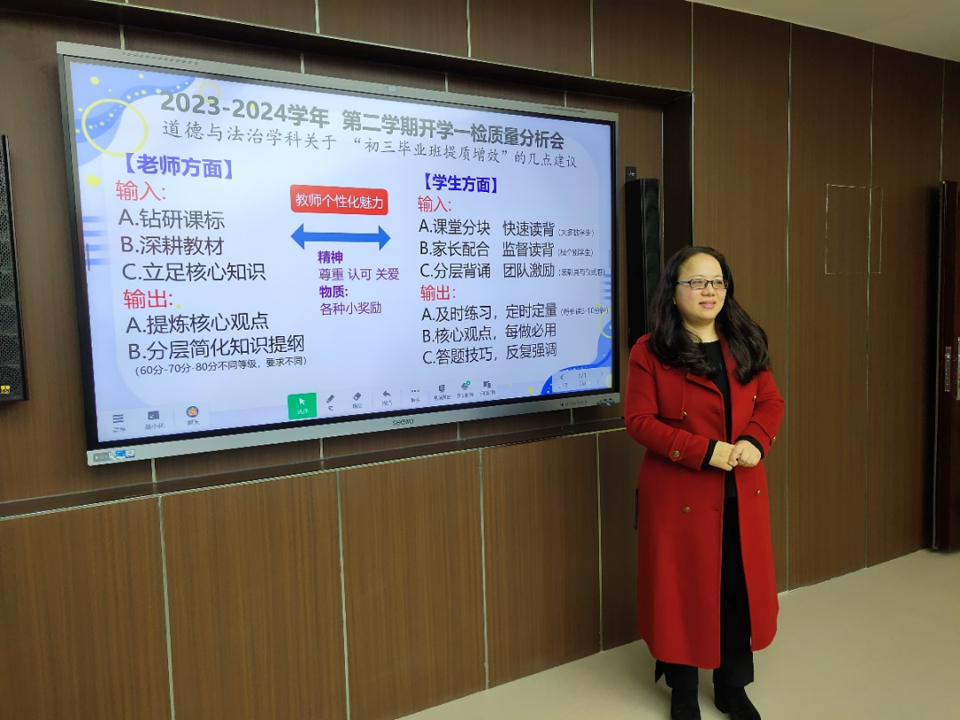 会议开始,由教务处黄照主任分析本校一检整体情况、历届的发展趋势、各班级学科情况,对初三各学科的进步表示肯定。提出了本学期的工作重点:1.继续努力,超越2023届,实现连续进步;2.强化培优,重点关注薄弱学科提升,确保更多同学考入优质高中。