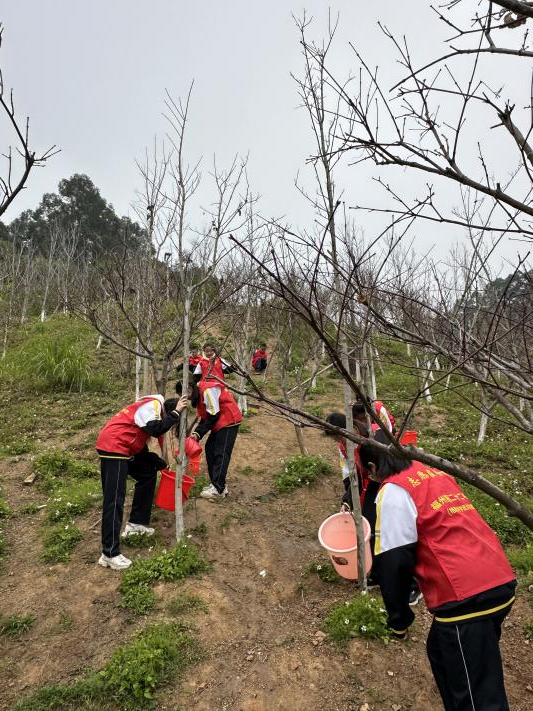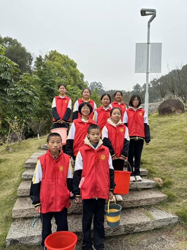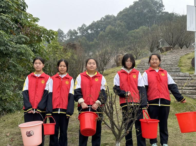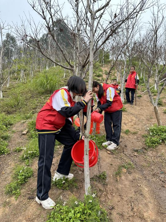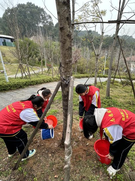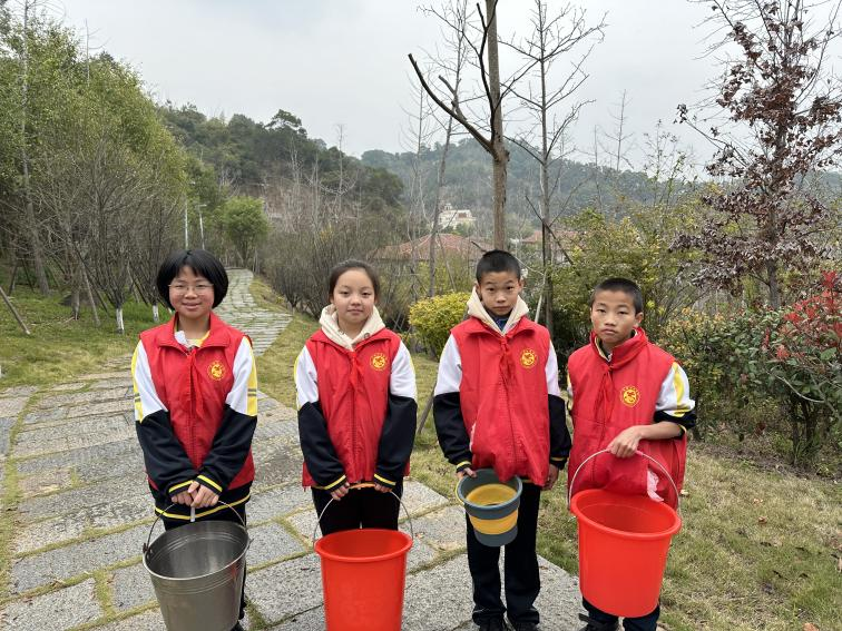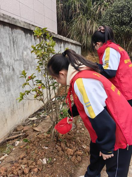树苗全部种好之后就到了“投喂”环节,同学们拎着水桶,“喂”小树苗“喝水”,水一点一点从桶中流出,时间也滴答滴答地从指缝中溜走,同学们眼前似是浮现出了小树苗成长为参天大树的样子。