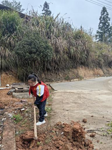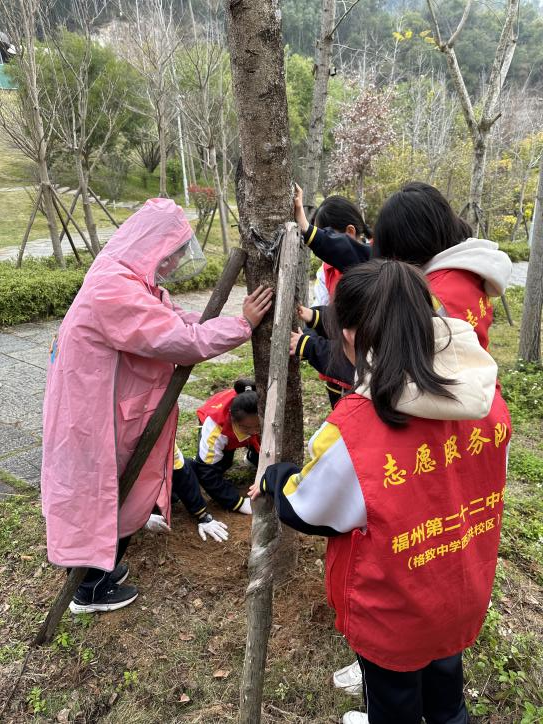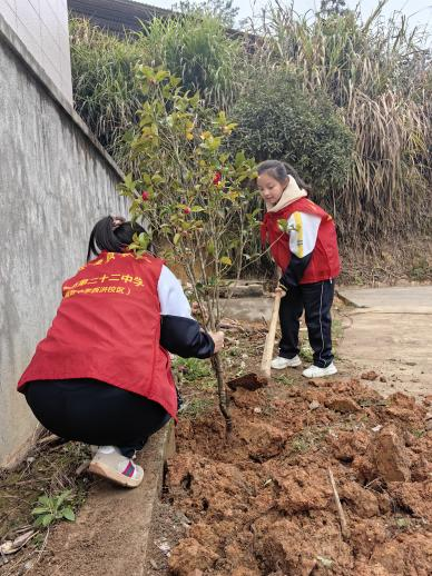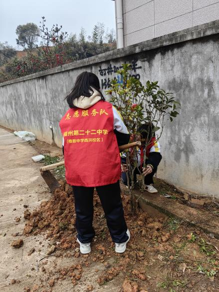 活动开始了,只见一位同学举起锄头在地上挖出了一个个为小树苗准备的“小房间”,几位同学小心翼翼地扶着“弱不禁风”的小树苗,生怕一个不小心将小树苗给“摔”着了,不过好在有惊无险,一棵棵树苗总算是“安了家”。