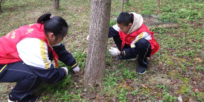 浇完了水,接下来要干什么呢?同学们抬脚迈向了旁边的一片树林,原来他们是要去除草啊!只见同学们不约而同的蹲下身,手握住杂草的茎,一用力就将杂草连根拔起了,他们保持着这个劲头,飞快地完成了除草的任务。