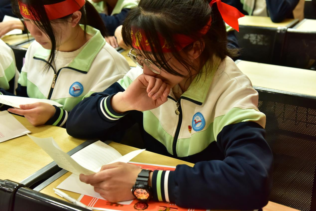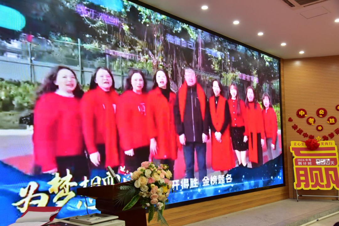 在成长的过程中,家人挚友永远是最坚强的后盾。在温馨的氛围中,播放了家长们精心为孩子们准备的加油视频,阅读家长们给孩子书写的一封亲情信,让孩子带着父母深厚的爱踏上中考征程。接着,在同学们的期待声中,优秀学长学姐们带来了惊喜视频,他们站在同学们的理想学府提前预祝初三学子金榜题名。同学们踌躇满志,信心满满!