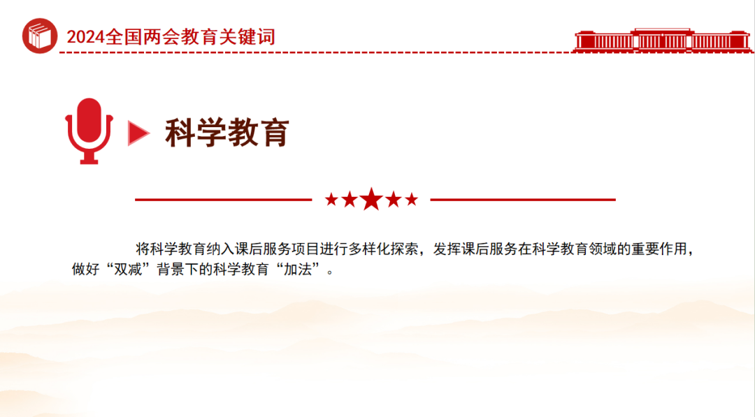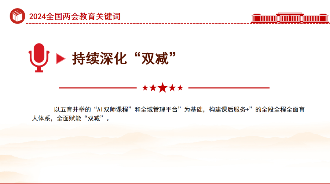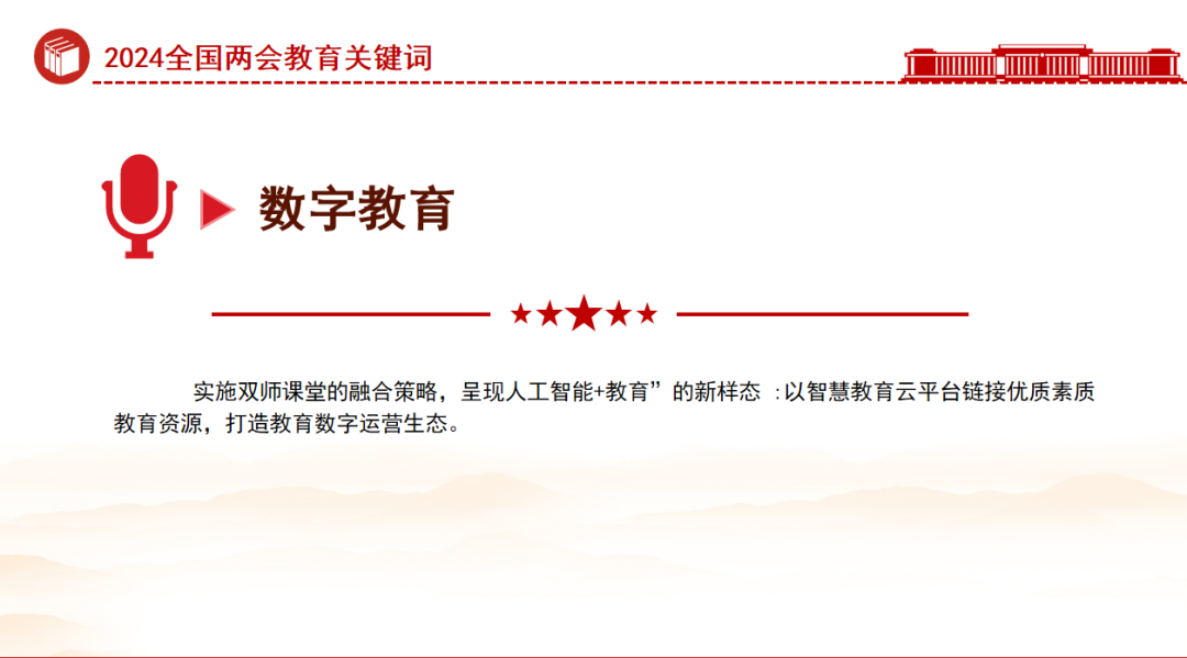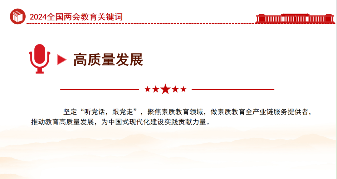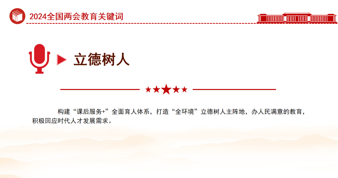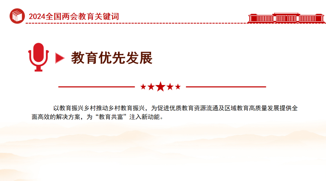 2024年政府工作报告指出,加强高质量教育体系建设。全面贯彻党的教育方针,坚持把高质量发展作为各级各类教育的生命线。制定实施教育强国建设规划纲要。落实立德树人根本任务,推进大中小学思想政治教育一体化建设。我们要坚持教育优先发展,加快推进教育现代化,厚植人民幸福之本,夯实国家富强之基。