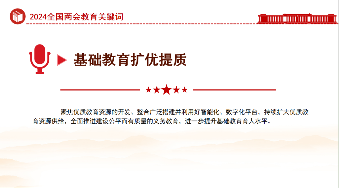 陈琛书记以“学习贯彻两会精神,强化教育使命担当”为主题,围绕“两会关于教育发展的重要内容、2024年两会关于教育提到的关键词”两个方面内容进行阐释。