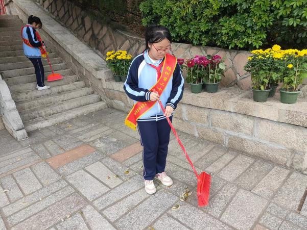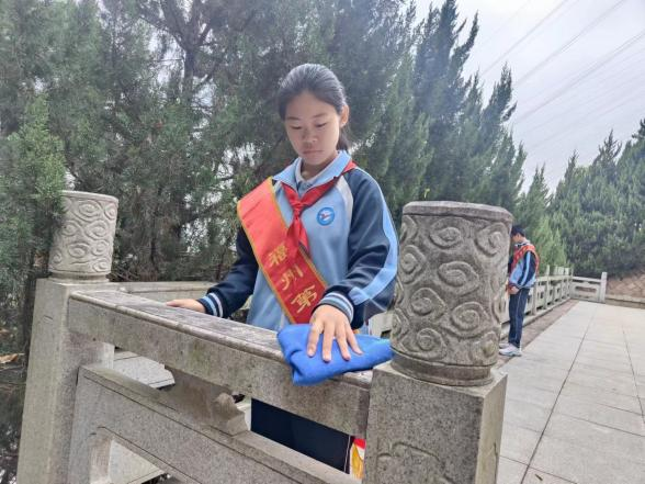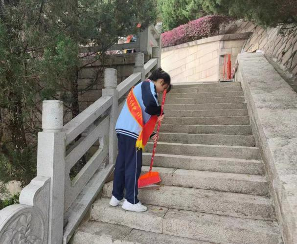 结束之后,同学们手持扫帚、抹布,怀着崇敬的心情清洁烈士陵园周边环境,对烈士纪念碑前的空地以及阶梯进行打扫。