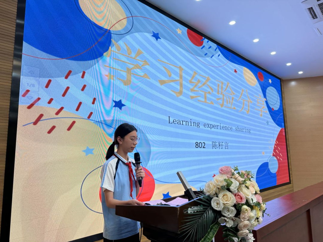 提升与超越离不开自己的刻苦拼搏,也离不开他人的引领。优秀学生代表初二(2)班陈籽言同学分享了自己的学习方法,丰富词汇量,梳理知识点,整理错题集,训练记忆力。从现在开始,长期坚持,以日积月累之功,收水到渠成之效。