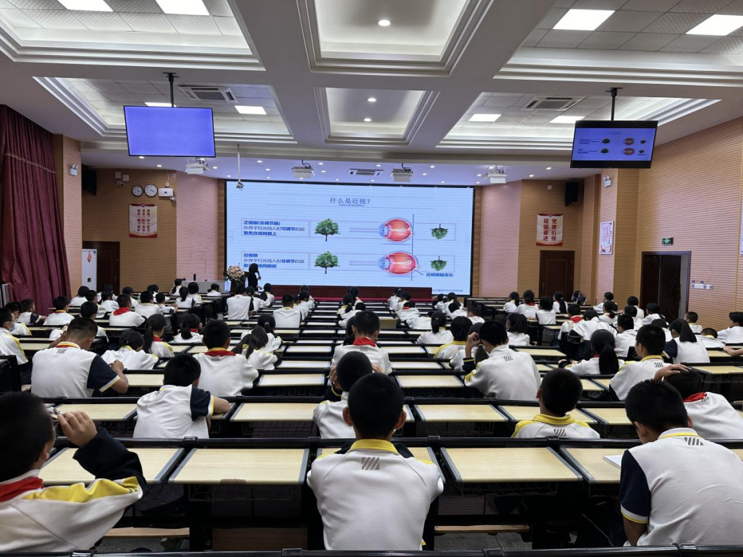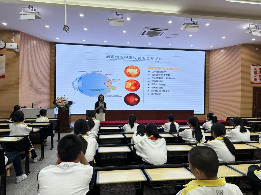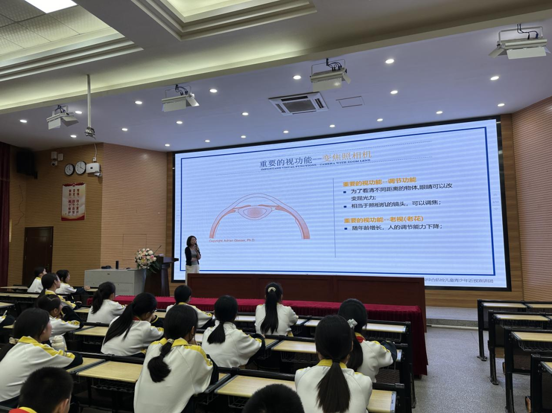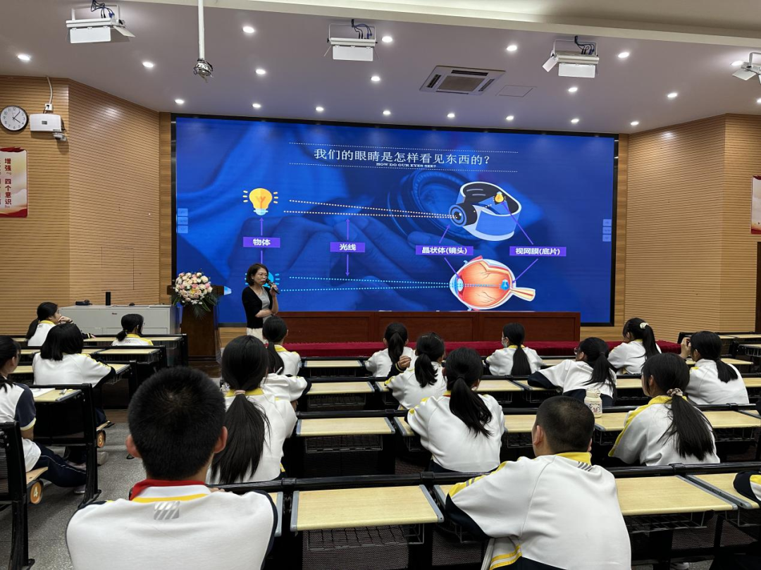 科普讲座中,张晶津专家采用PPT形式,从“认识眼睛;怎么及时发现近视;导致近视的常见原因;预防近视的办法;近视后怎么办”几个要点,为同学们展开详细的介绍。