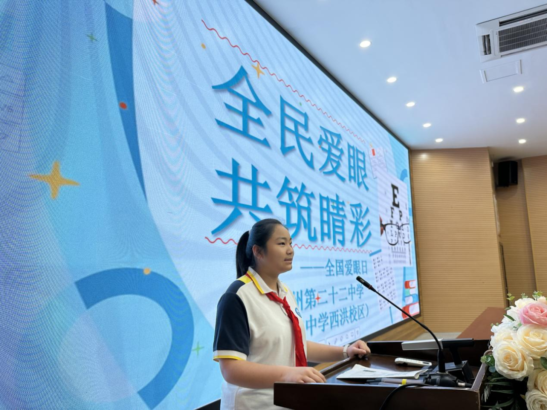 初一(2)班王婧灵同学在国旗下讲话中呼吁同学们要养成良好的用眼习惯,科学用眼、适当增加户外活动、合理饮食、定期检查视力、树立正确的用眼观念。
