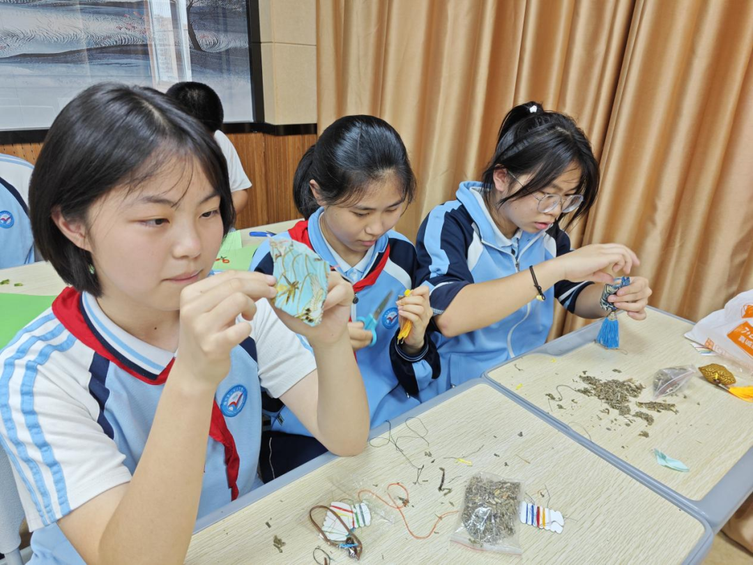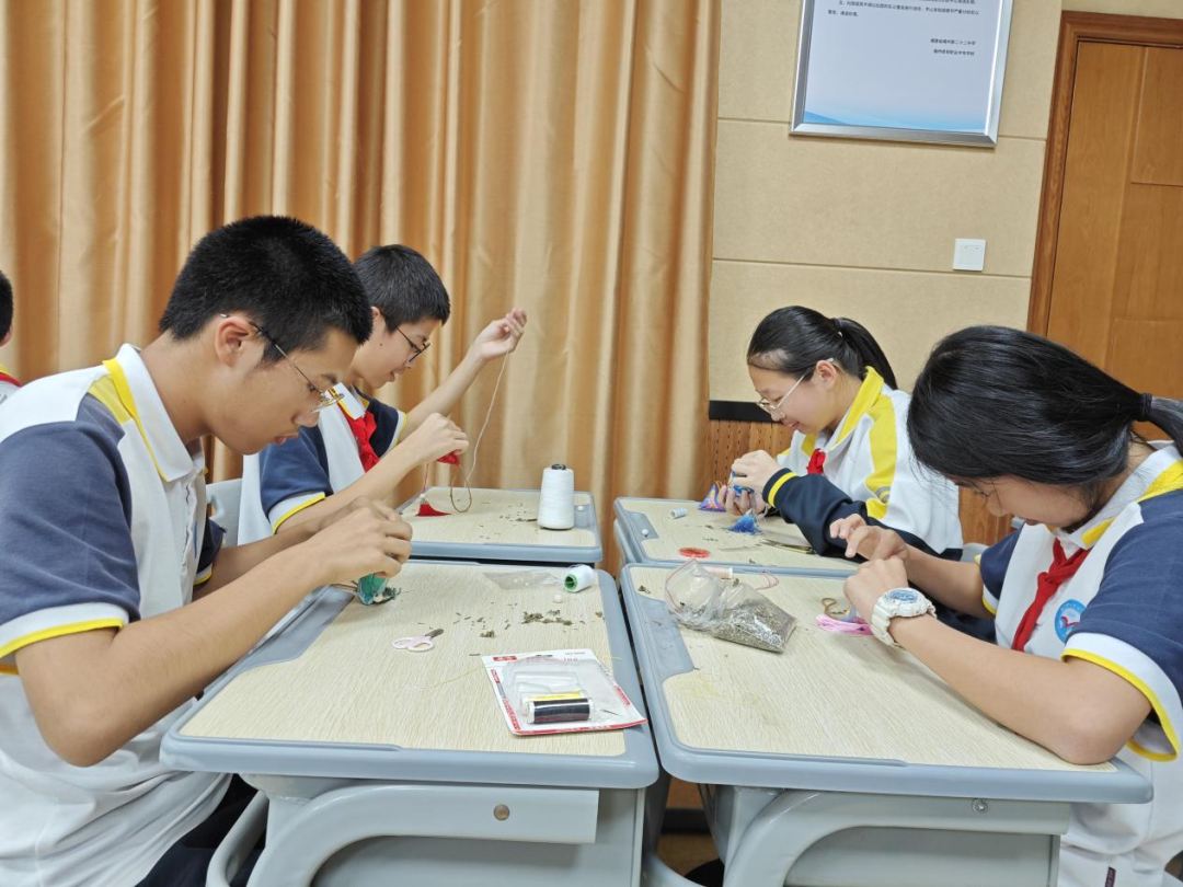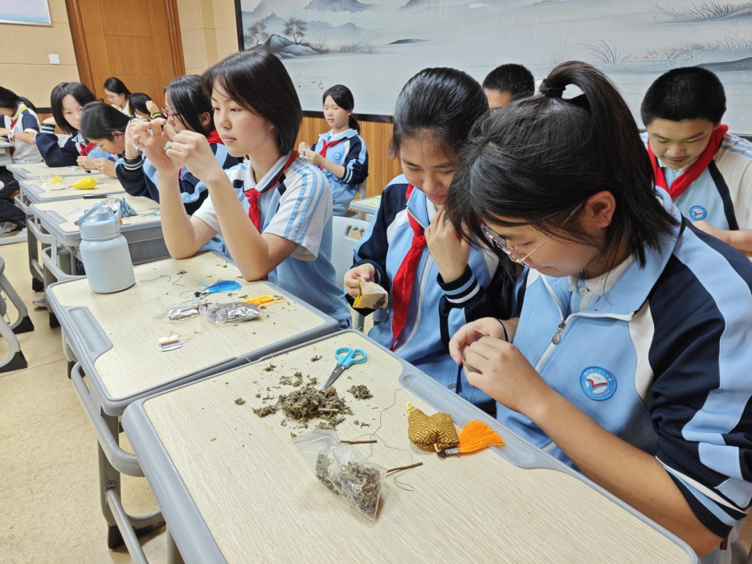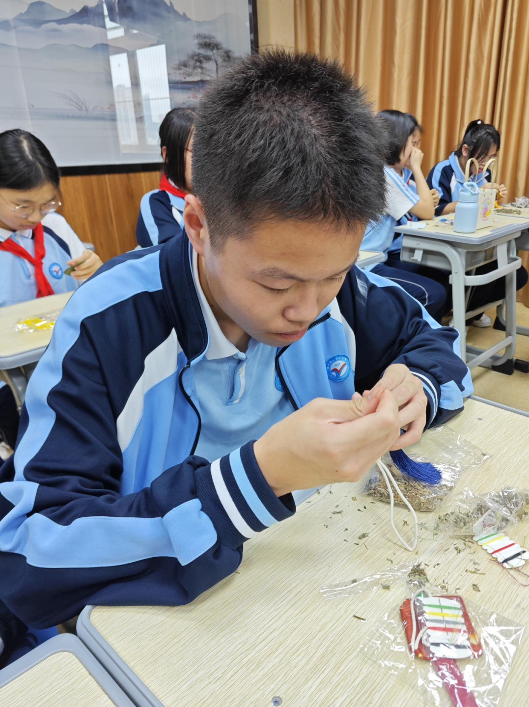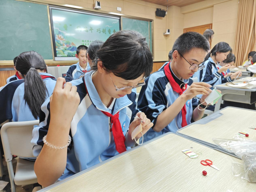 同学们拿出提前准好的材料,穿针、引线、系结、装入艾草,一针一线细密工整,随着一双双巧手上下翻舞,一个个立体饱满、精致美观的香囊跃然而出。