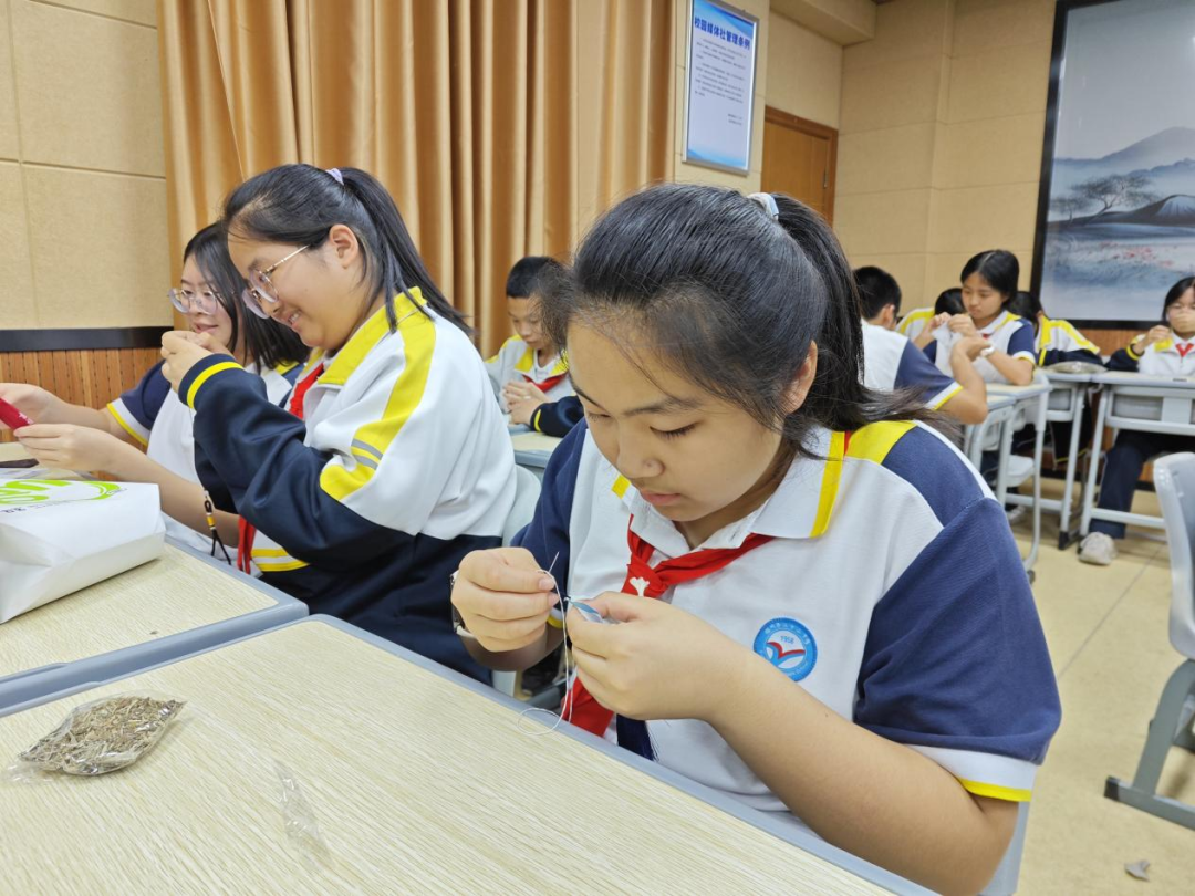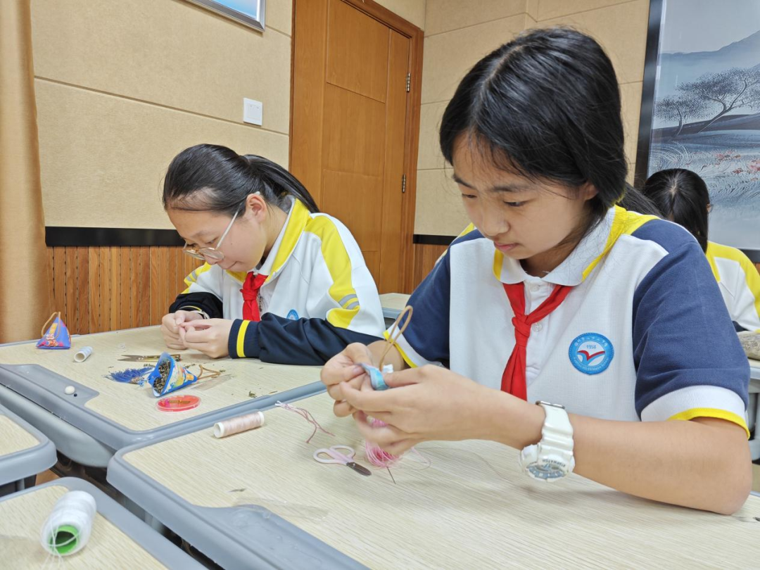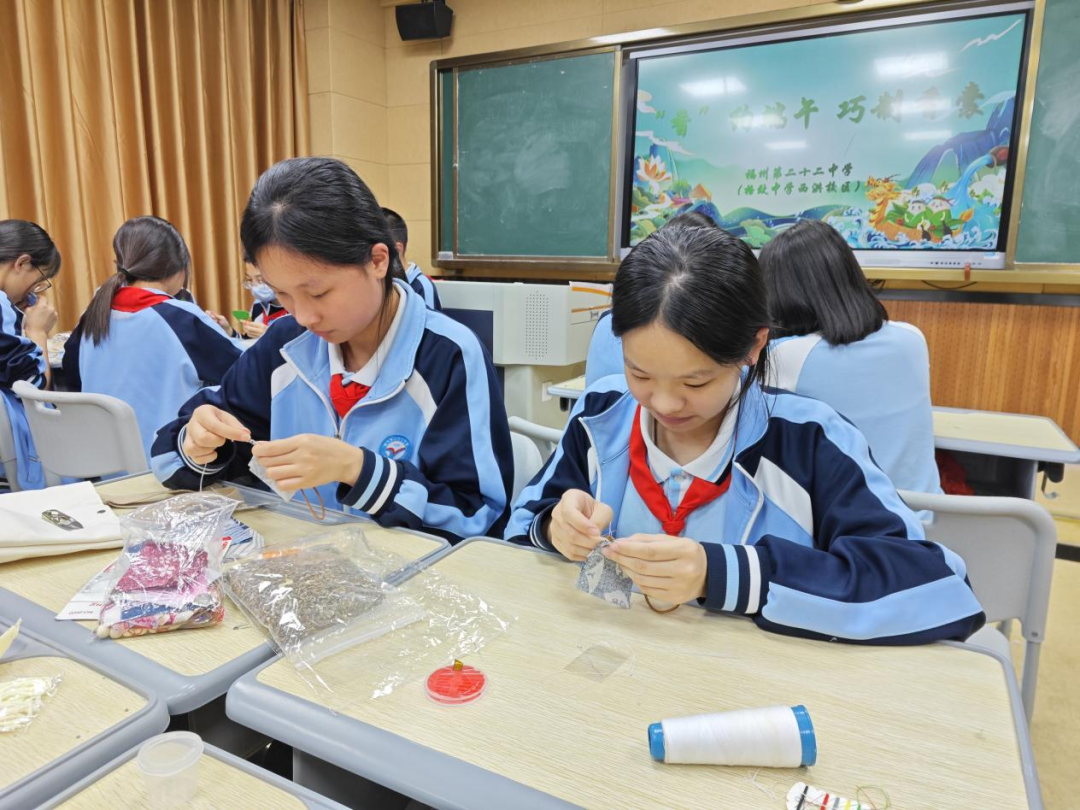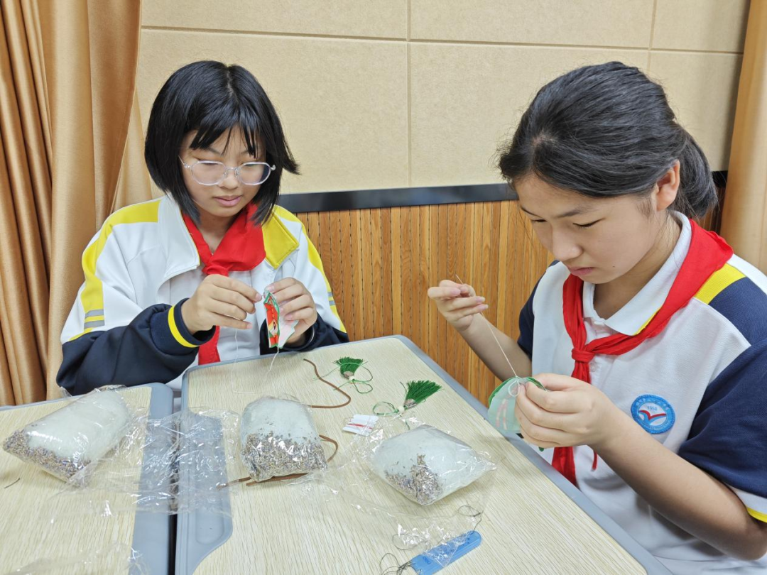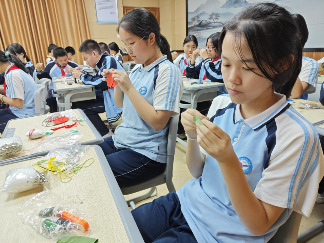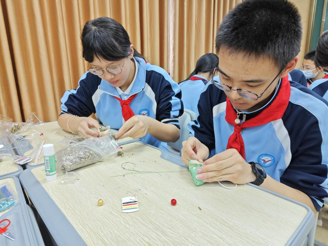 同学们拿出提前准好的材料,穿针、引线、系结、装入艾草,一针一线细密工整,随着一双双巧手上下翻舞,一个个立体饱满、精致美观的香囊跃然而出。