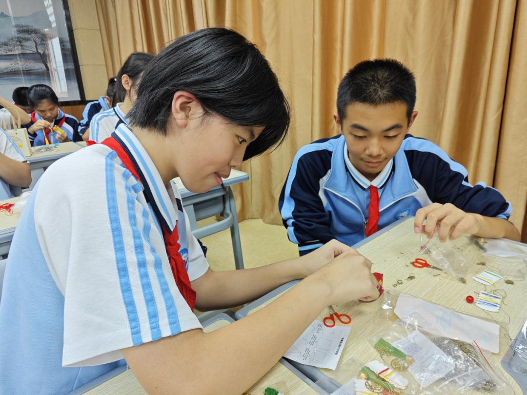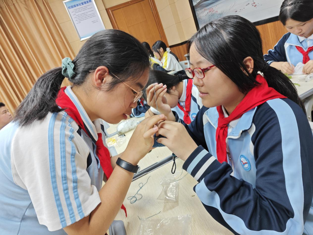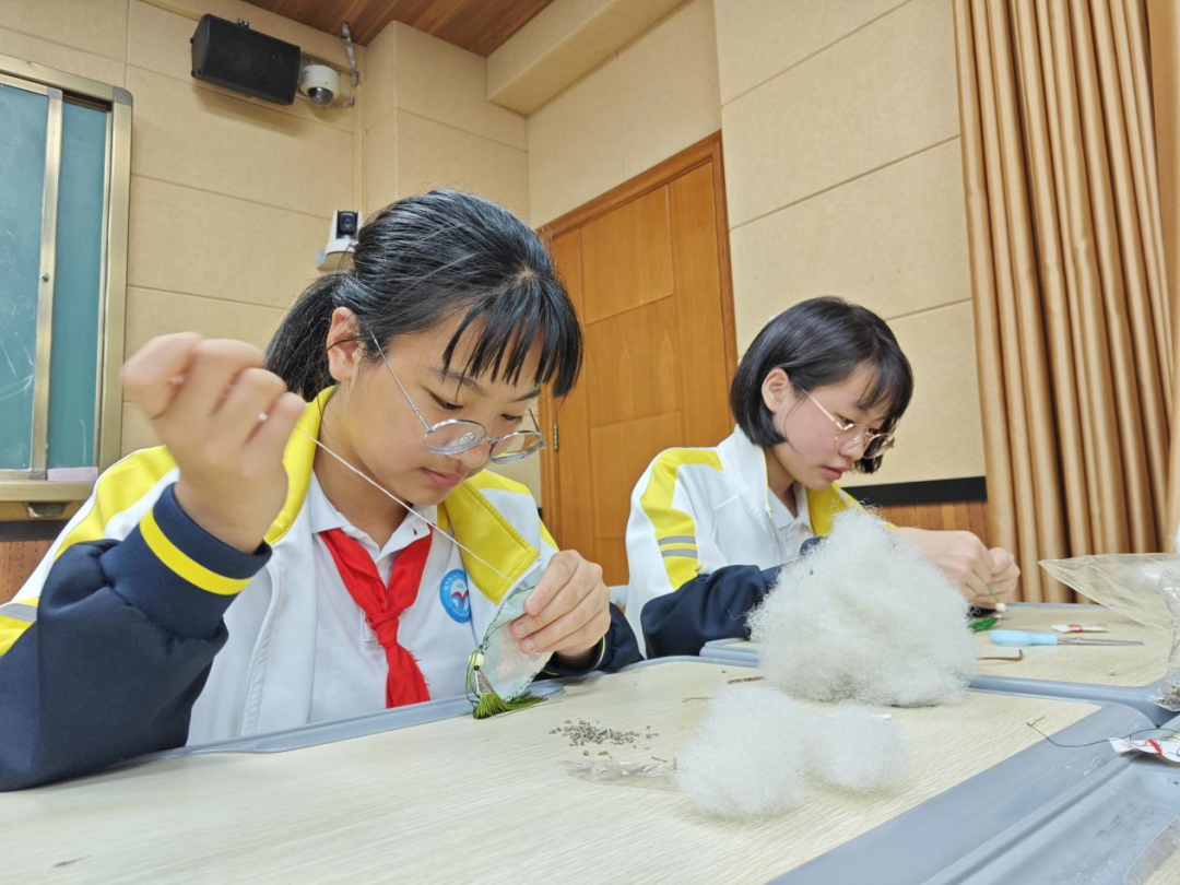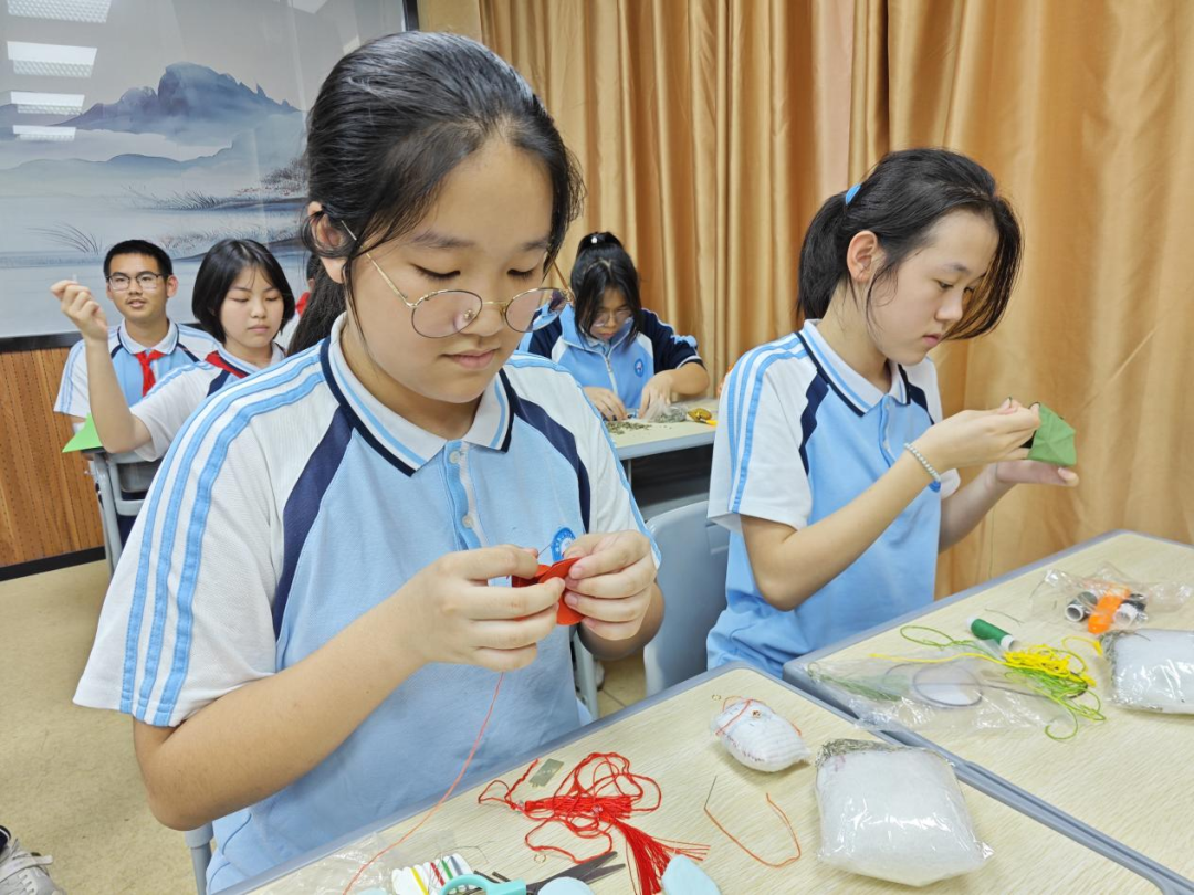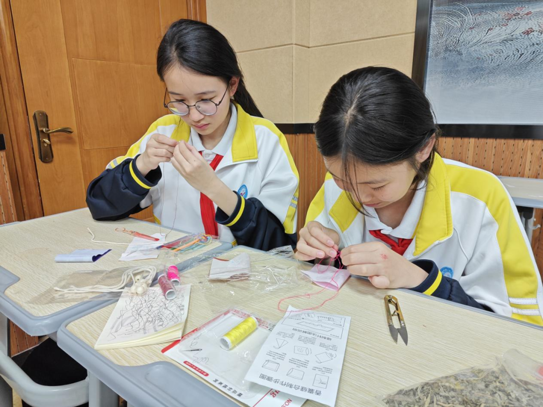 同学们拿出提前准好的材料,穿针、引线、系结、装入艾草,一针一线细密工整,随着一双双巧手上下翻舞,一个个立体饱满、精致美观的香囊跃然而出。