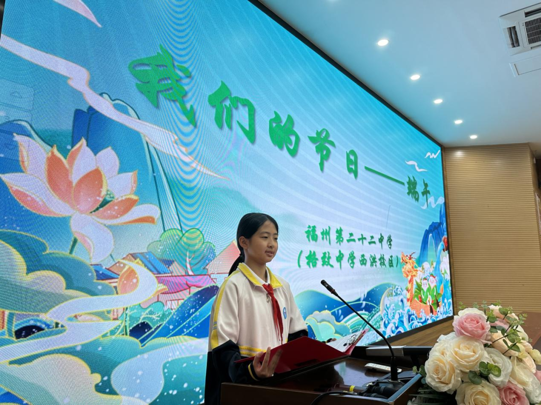 6月3日,初一3班张恩慈同学就即将到来的端午节进行了“我们的节日——端午”国旗下讲话,端午节是我国的传统节日,始于春秋战国时期,至今已有两千多年的历史。这天,人们会通过赛龙舟、包粽子等形式来纪念一颗不朽的灵魂——屈原。每年的五月初五,人们都会自发地来到江边,悼念屈原,还要划着船冲进汹涌的波涛,象征人们争相打捞屈原遗体,以此来寄托对屈原的哀思。久而久之就形成了端午节赛龙舟的习俗。