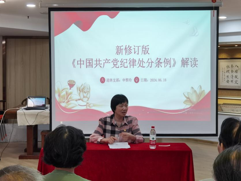 退休支部书记申黎玲以《新修订版<中国共产党纪律处分条例>解读》为主题在锦江社区林峰党建工作室为退休支部老党员们开展了一场别开生面的党纪学习教育专题党课。申黎玲书记表示,纪律是“高压线”也是“通行证”。遵守党纪不是一蹴而就的,而是需要大家长期坚持和不断努力。我们虽然离开了工作岗位,但党员的身份始终没有变,党纪要求不能放松,学习更不能松劲。
