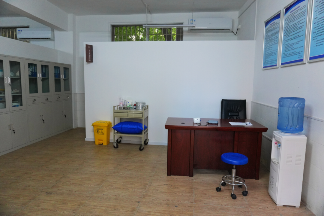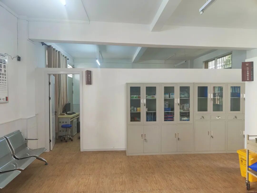 为更好保障学生身体健康,学校对卫生室进行重建,新的卫生室更加宽敞,药品柜陈列整齐,找取方便,配置冰箱放置特殊的药品,配置单架、治疗床。