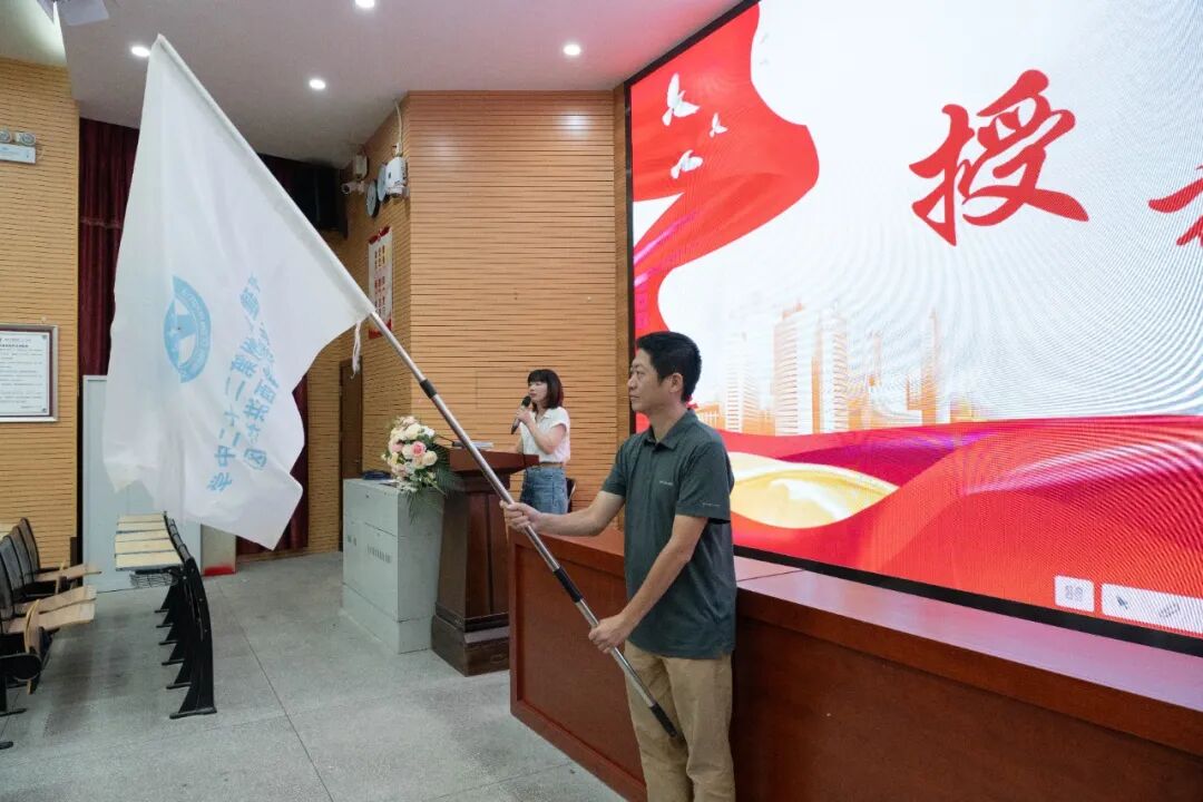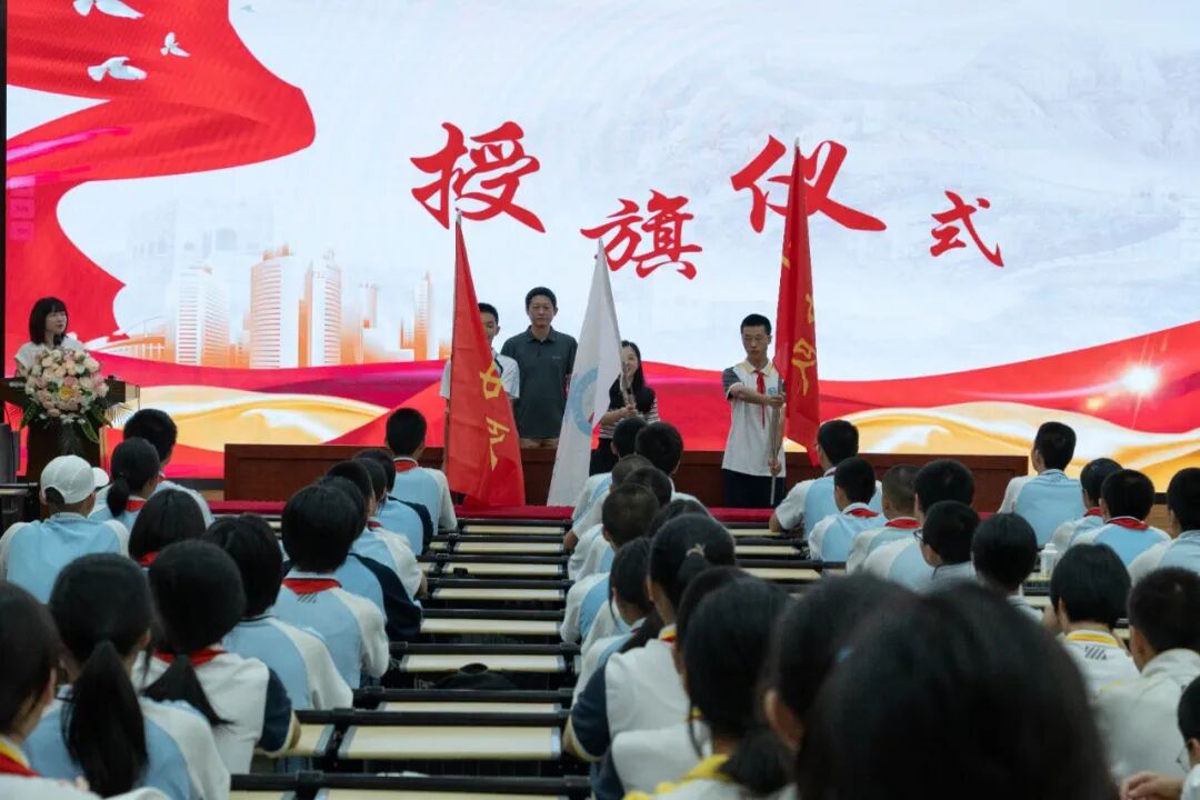在授旗仪式环节,教官将校旗庄重地交给领导,领导随后将校旗授予代表老师。这一举动象征着学校对本次研学活动的全力支持和信任。紧接着,教官将研学班旗交给老师,再由老师转交给各班级选出的学生代表。同学们手持班旗,脸上洋溢着自豪和喜悦的笑容,这一刻,他们感受到了团队的力量和荣誉的归属。