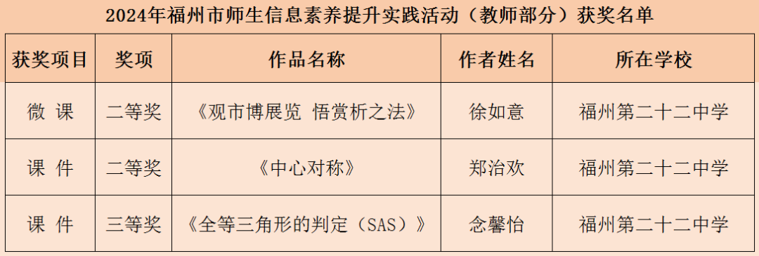 在福州市教育局组织的2024年福州市师生信息素养提升实践活动(教师部分)中,我校徐如意、郑治欢、念馨怡三位老师的作品获奖,其中二等奖2项,三等奖1项。特此祝贺!