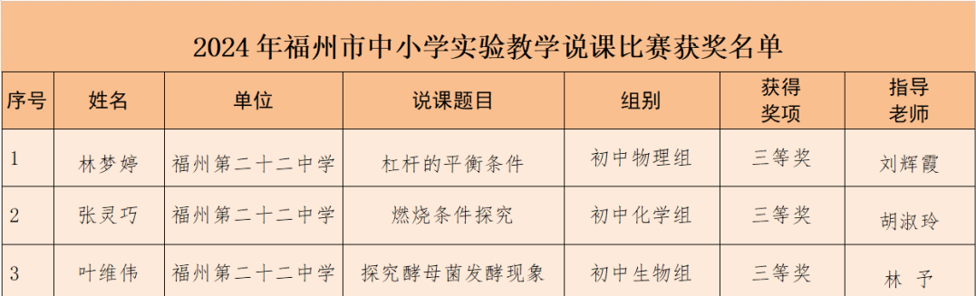 近日,福州市教育局公布2024年福州市中小学实验教学说课比赛获奖名单。我校林梦婷、张灵巧、叶维伟三位老师在比赛中获奖。特此祝贺!