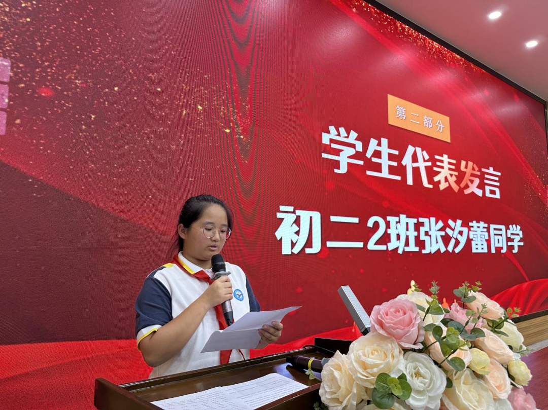 张汐蕾同学还表达了对新学期的期待与决心。她说:“回望过去的一年,我们初一的旅程充满了挑战与成长。从初入初中的懵懂与好奇,到逐渐适应并融入这个快节奏的学习环境,每一步都凝聚着我们的汗水与努力。”面对即将到来的挑战,她呼吁同学们:“树立明确的目标,珍惜时光,勤奋学习,勇于面对困难,敢于挑战自我。”