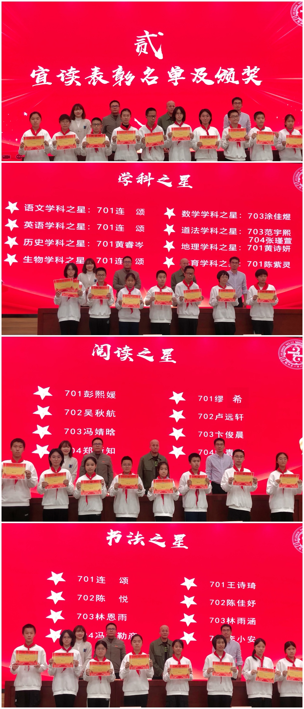 每一份荣誉背后,都凝聚着同学们不懈的努力和汗水,也见证了他们在成长道路上的每一次跨越与突破。怀着对获奖者的期待,大会依次颁发了“学习标兵”“学科之星”“阅读之星”“书法之星”等多个奖项。