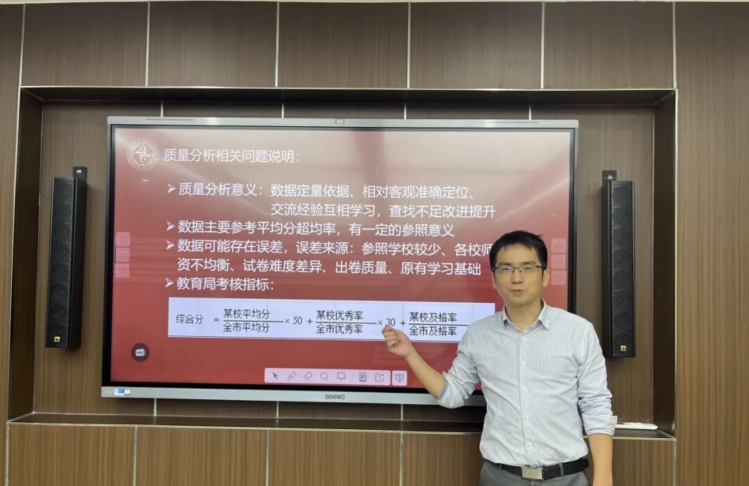 教务处黄照主任详细分析本次半期考成绩数据,从各班及各学科进行横向与纵向的对比,对初一年段取得的成绩表示肯定,并针对本次考试的情况,给出下一步年段工作的重点。