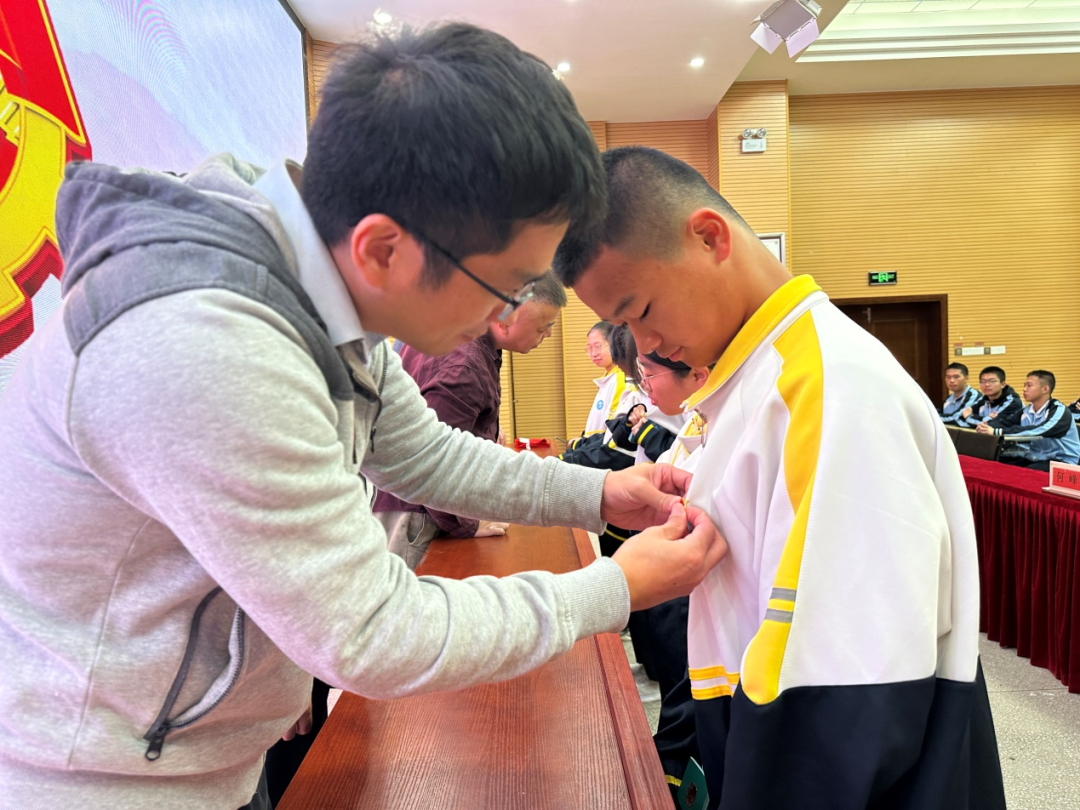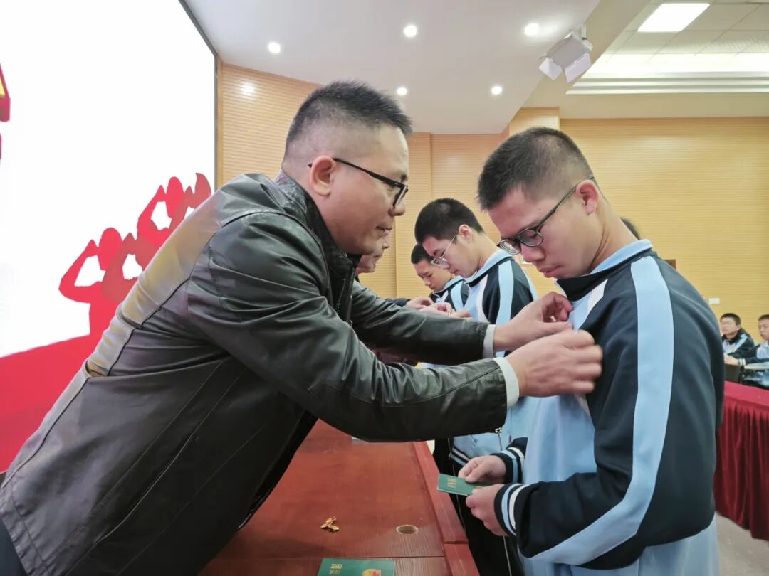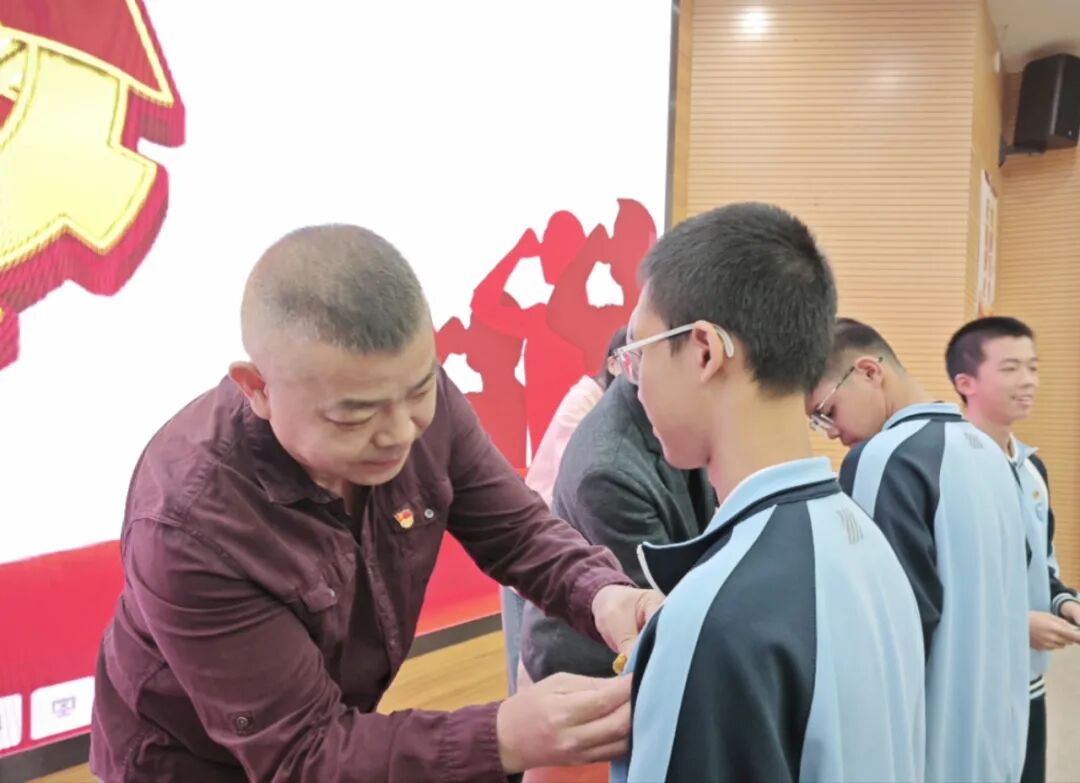 在团旗的见证下,新团员们依次走上舞台,与会领导为新团员佩戴团徽。佩戴上团徽的那一刻,他们的脸上洋溢着自豪和喜悦,这也标志着他们正式成为一名共青团员。