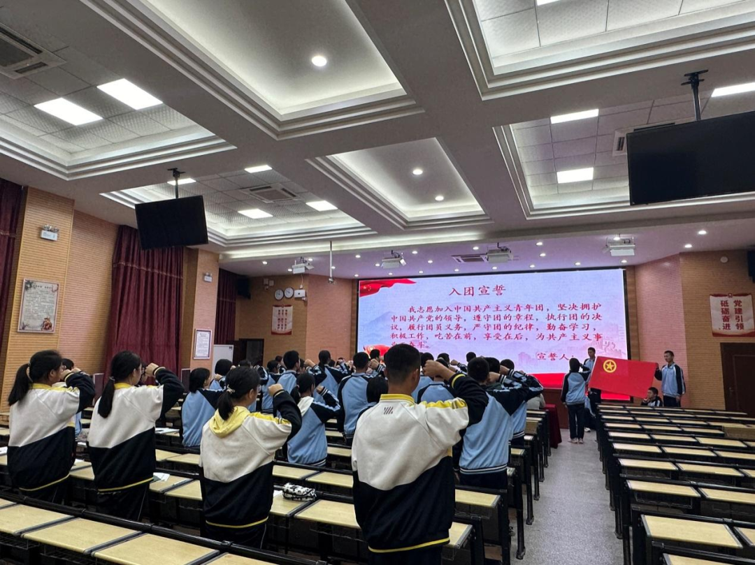 在初三团支部团支书李知芮同学的带领下,新团员们面向团旗,庄严宣誓:“我志愿加入中国共产主义青年团,坚决拥护中国共产党的领导,遵守团的章程,执行团的决议,履行团员义务,严守团的纪律,勤奋学习,积极工作,吃苦在前,享受在后,为共产主义事业而奋斗!”