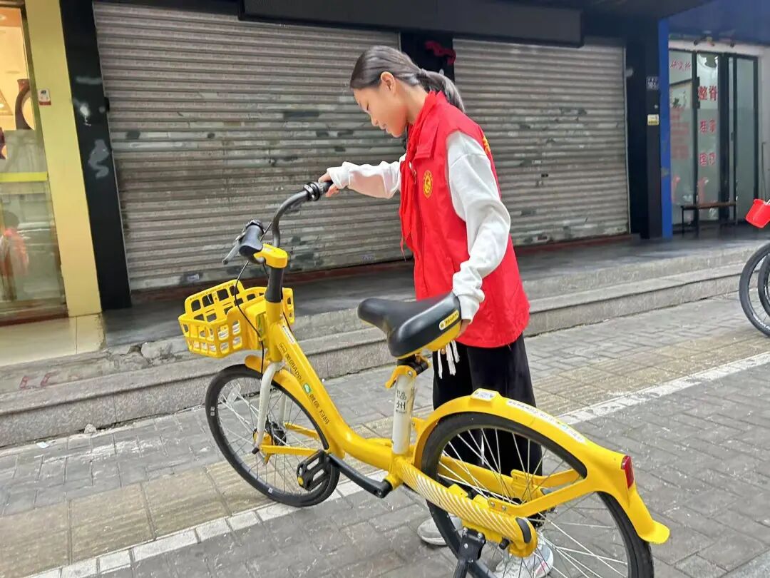 街道上随意摆放、东倒西歪的共享单车和自行车影响城市的美观,志愿者们将单车扶起,摆放整齐。